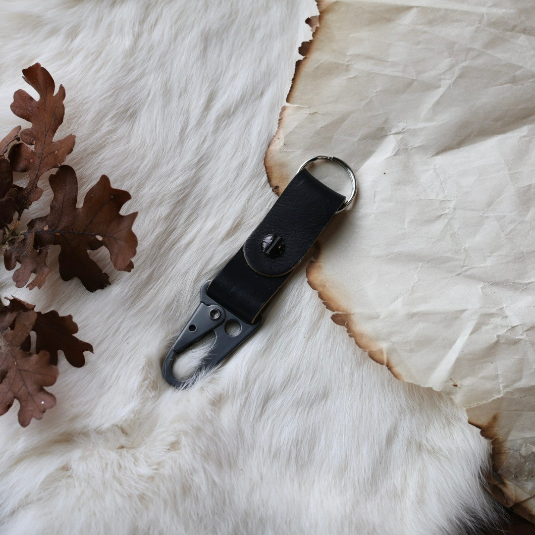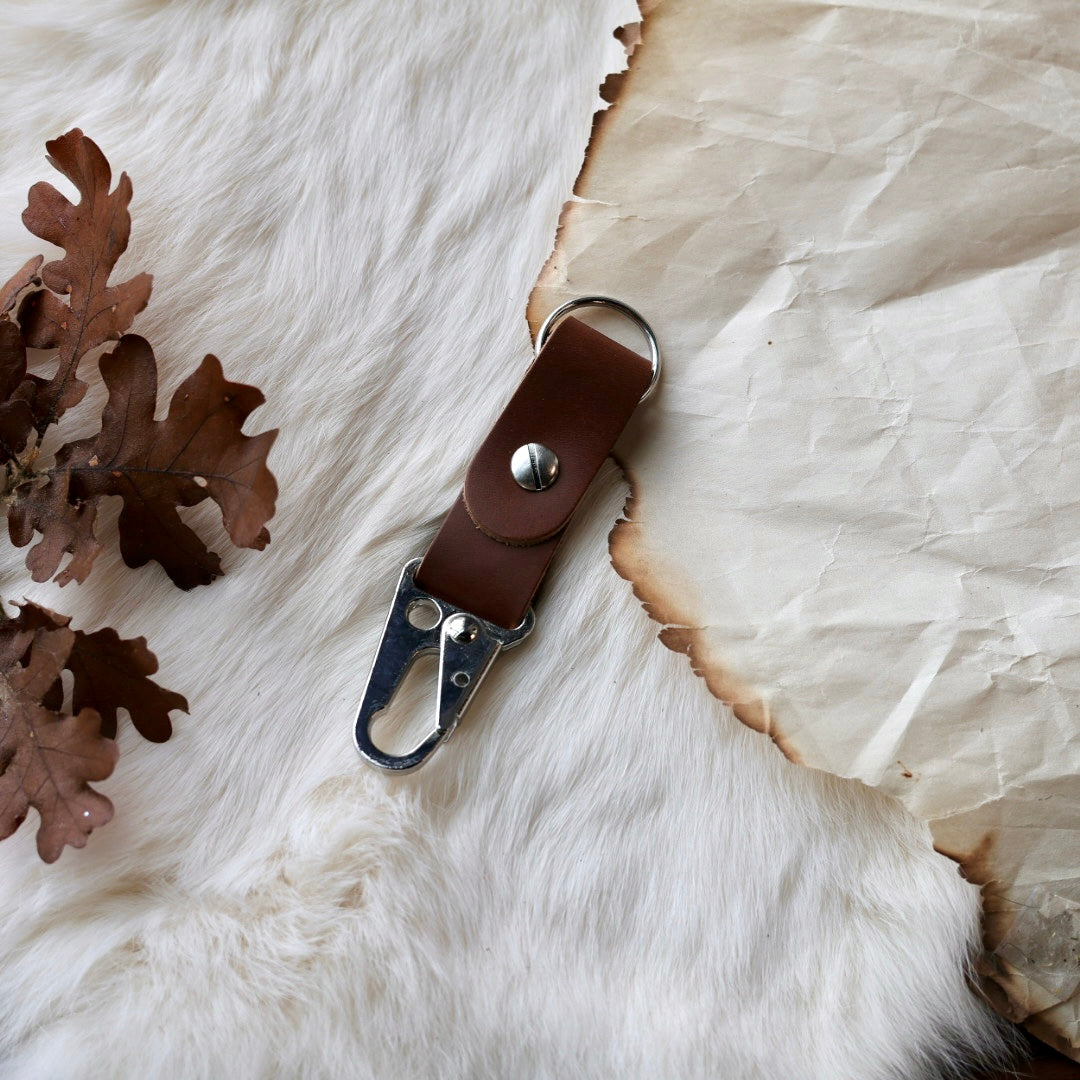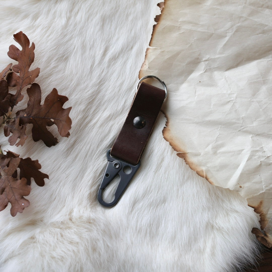 5" keychain crafted with full grain premium run leather that is hand punched and sewn. Complete on a 1" key ring, and features a durable stainless steel 2" rifle clip.