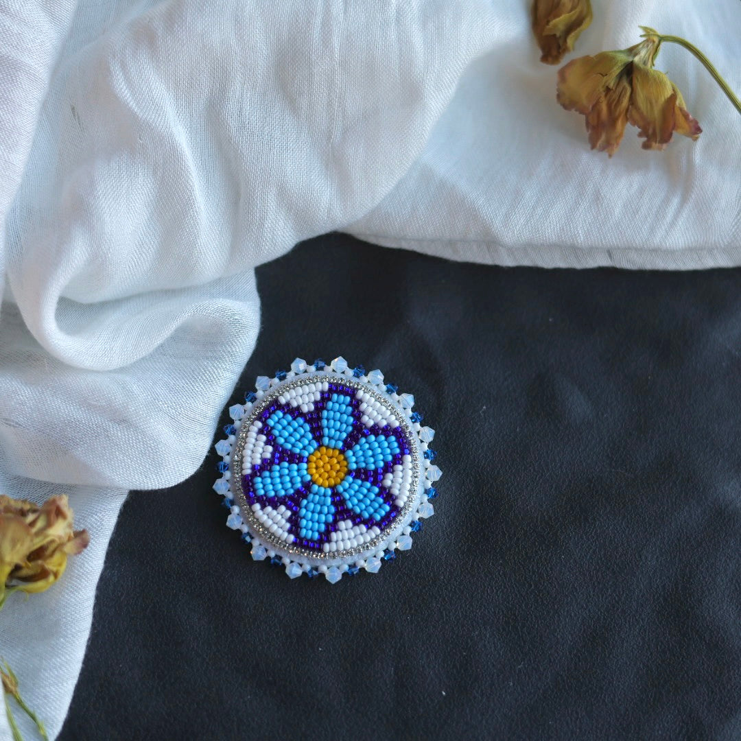 Lovely beaded brooch crafted with size 11 seed beads in a floral design, with accents of rhinestone and bicone beads. Measuring 2.25" diameter, finished with faux leather backing and a 1" clasp closure bar pin.