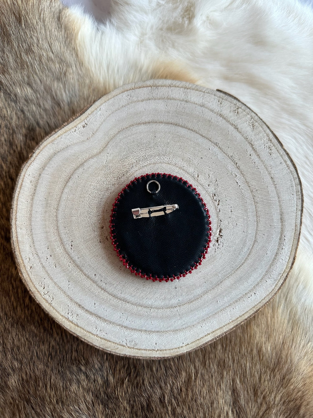 Beautiful handmade pin by the talented Beth Rose Designs. 2” in diameter and made with delicas, rhinestone banding and leather backing.