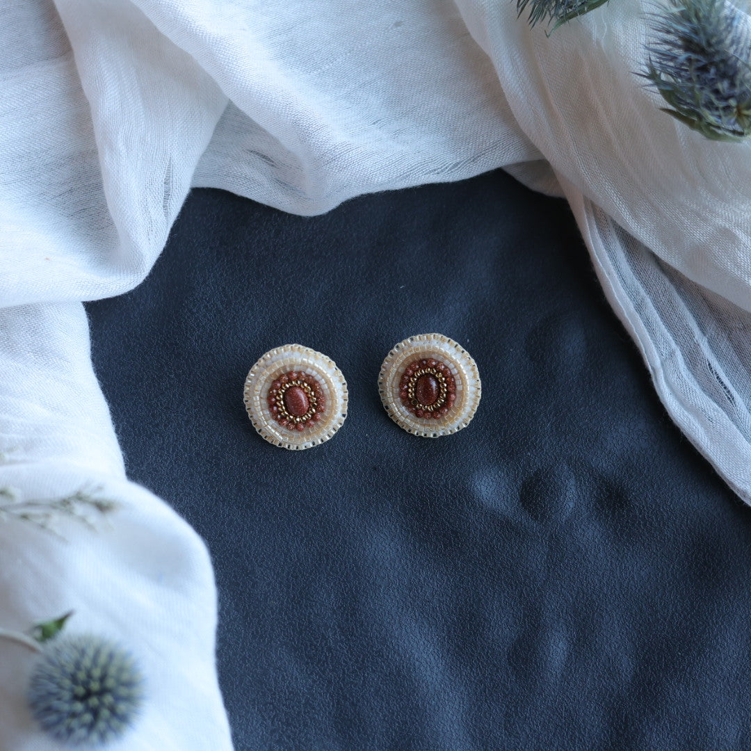 Petite goldstone crystal centre beaded with gold plated seed beads and delica beads, fancy rhinestone banding, with hide backing. Complete on gold plated stud posts measuring 1".