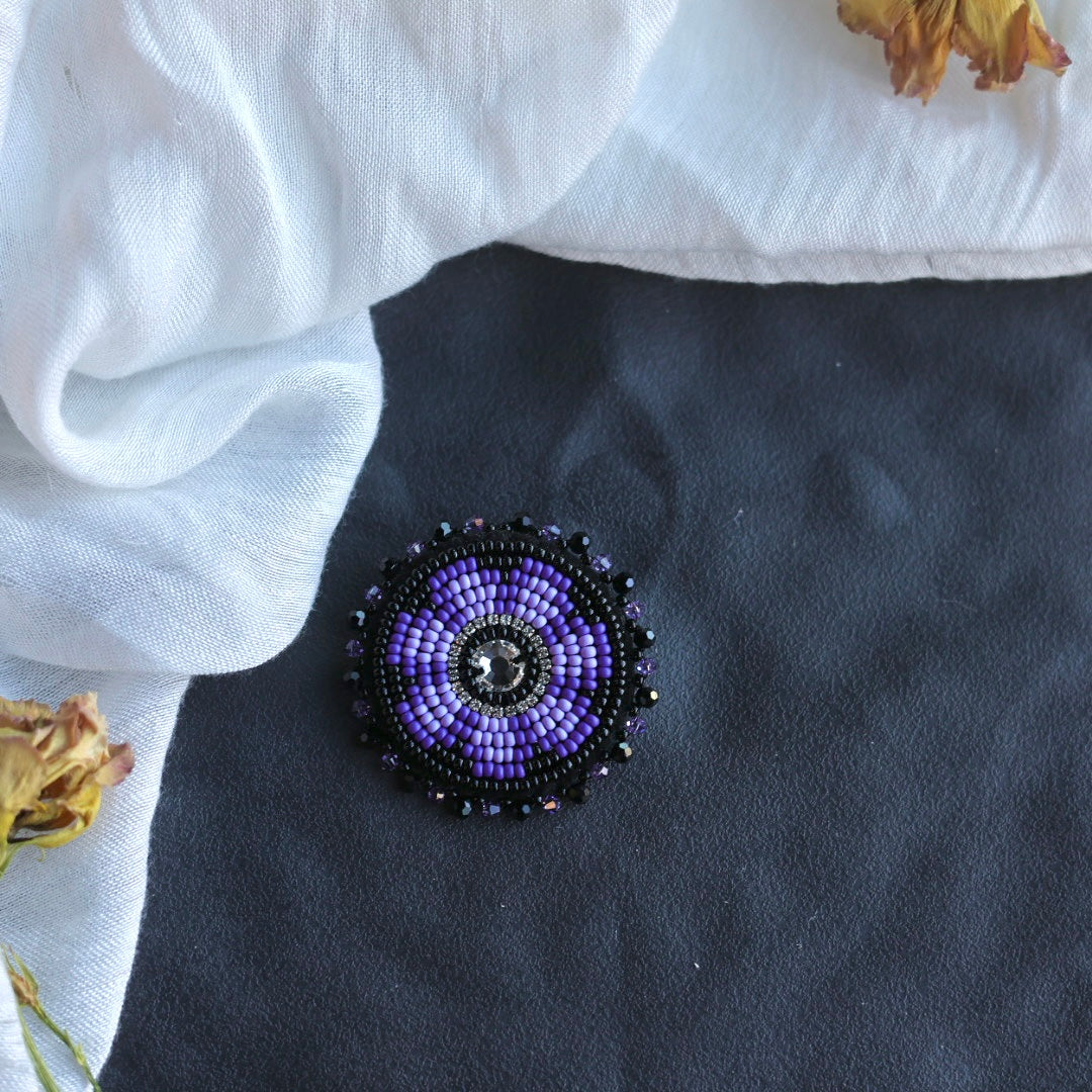 Lovely beaded brooch crafted with size 11 seed beads with accents of rhinestone banding and bicone beads. Measuring 2" diameter, finished with faux leather backing and a 1" clasp closure bar pin.