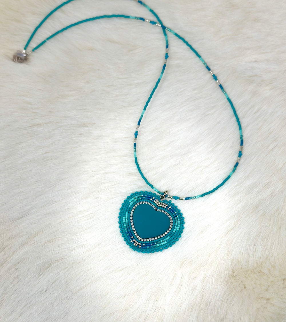 Fun, monochromatic turquoise heart earrings and necklace set. Necklace is 22" in length from clasp to clasp and earrings drop 2.75" from the hook. Size 11 miyuki delica beads and sterling silver (nickel free) clasps and hooks and white leather backing.