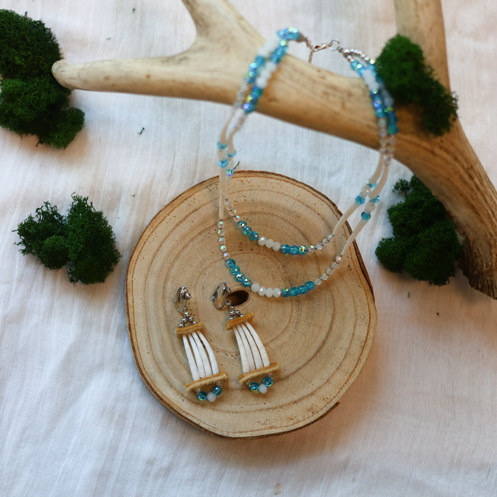 These beautiful dentalium necklace and earring sets are made with love by beardy artist Disa of Dee Iyapes. These are made with dentalium shells, bicones and gold beads. The earrings have smoked moose hide on them.