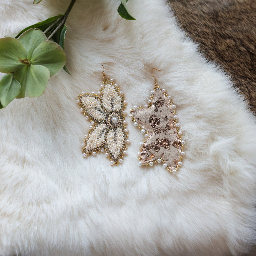 The perfect combo of being elegant and a statement. These large half floral beaded earrings by Mercedes include seed beads, manmade pearl beads 4mm, rhinestone banding and a center pearl embellishment. 18k gold sterling silver plated earring hooks, faux leather backing.