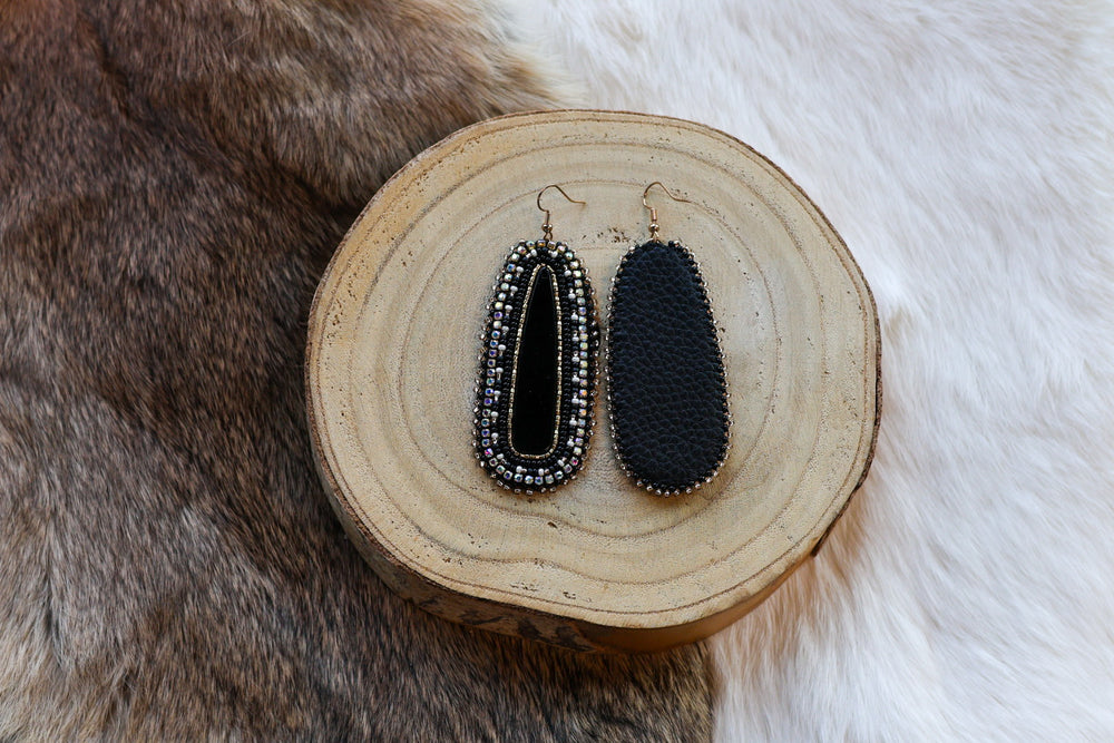 3" gorgeous earrings featuring gold delica seed beads, black size 11 seed beads. As well as iridescent banding, all hand made by indigenous artist Nikki P.
