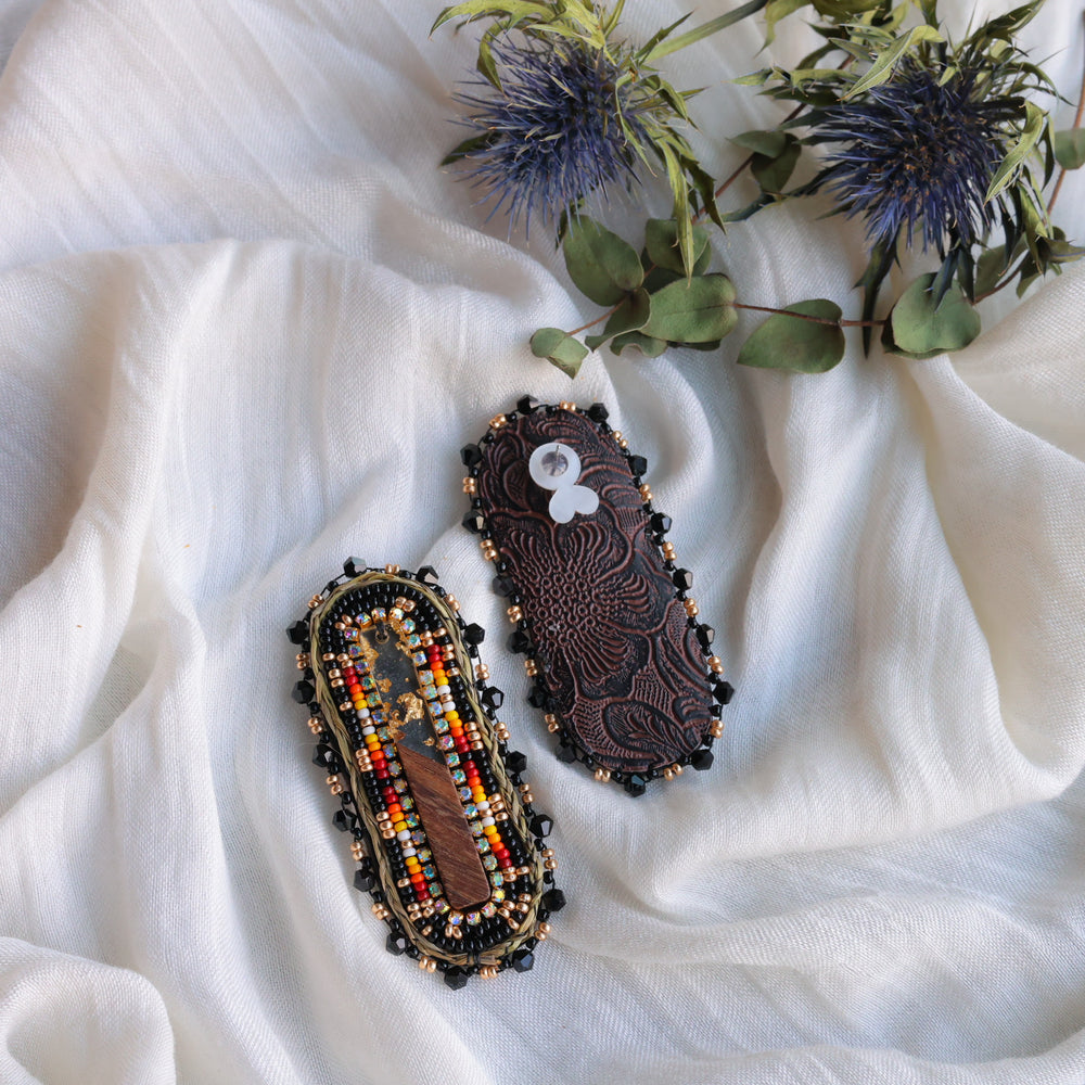 Delicate beaded stud earrings created with size 11 seed beads and complete with sweet daisy & rhondelle edging and faux tooled leather backing. Featuring wood centre cabs with each piece.