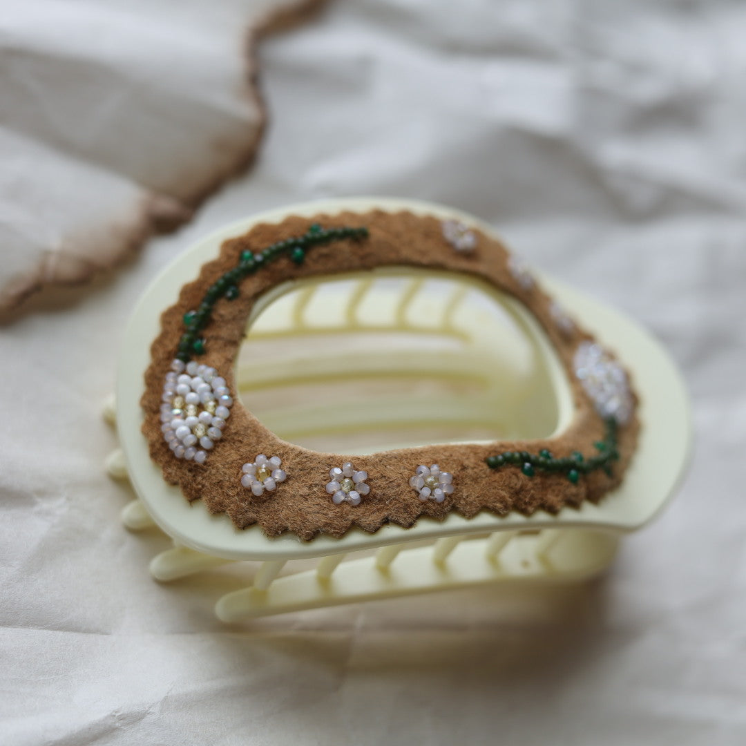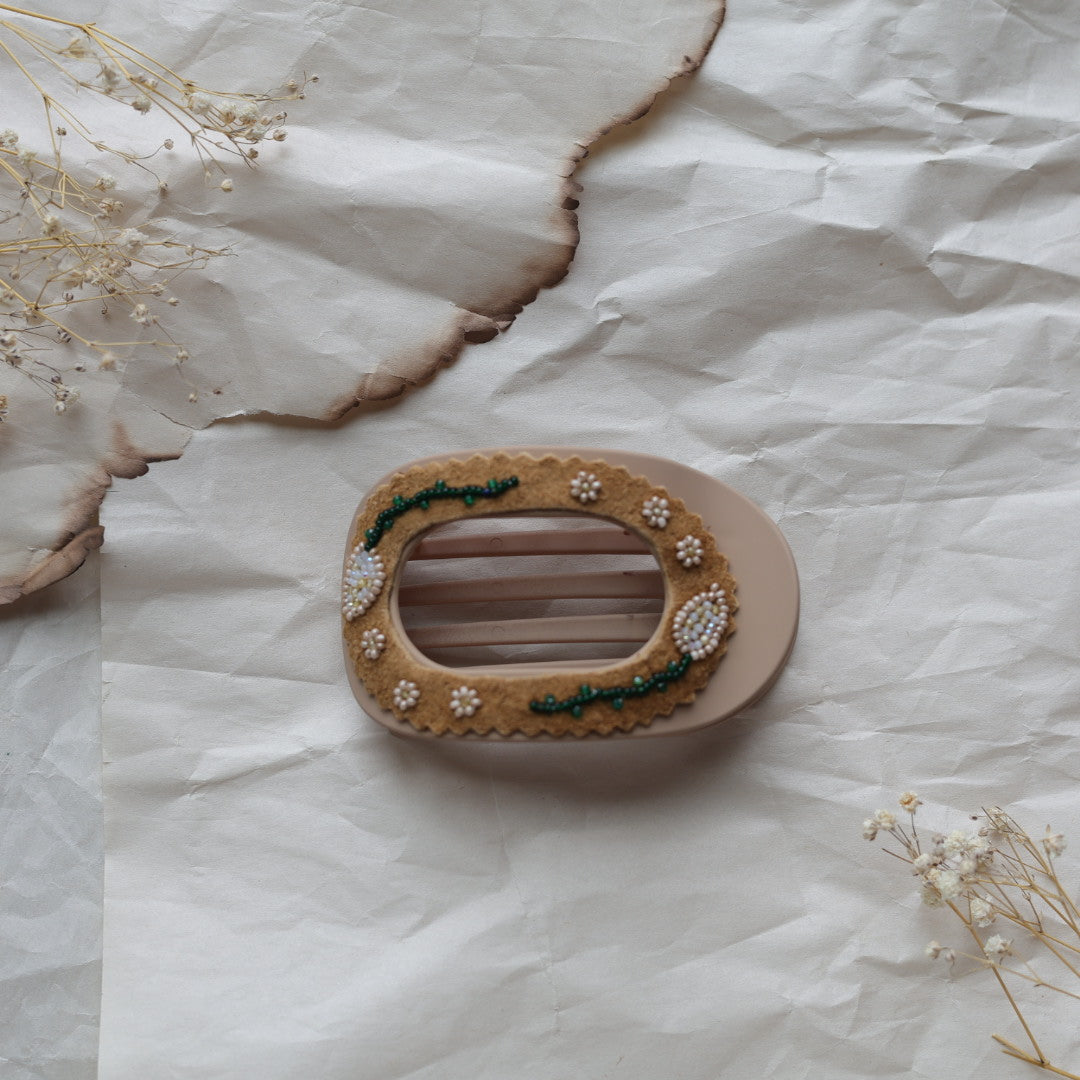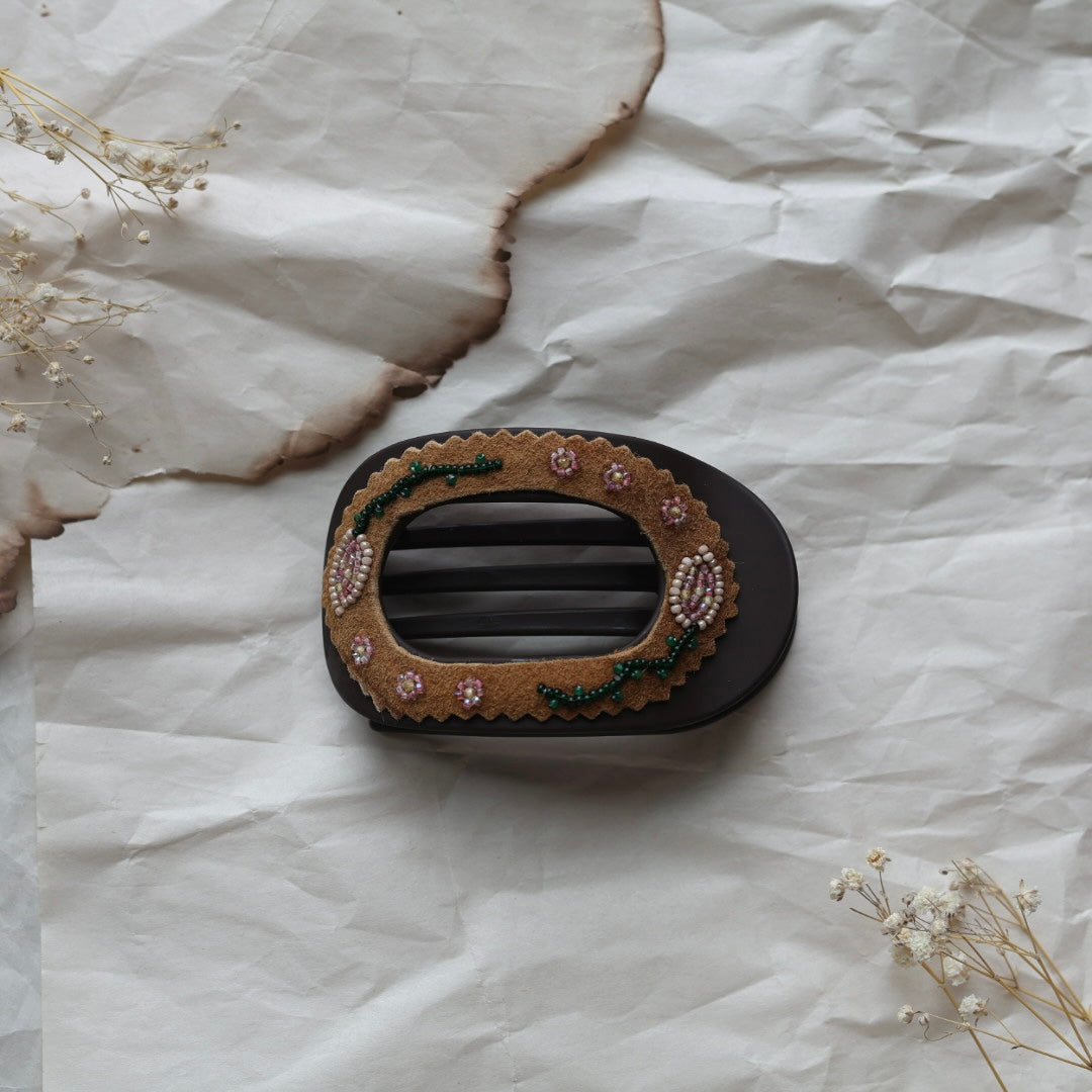 A unique take on the popular claw clips. Flat style claw clip, home tanned smoked moosehide beaded with a budding floral design of size 11 charlotte cut seed beads and accents of various faceted gemstone beads.