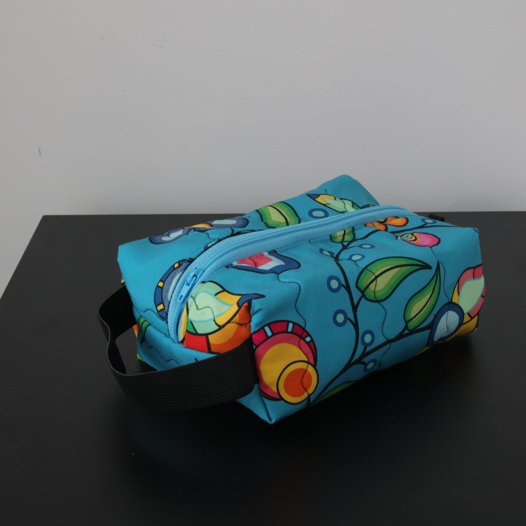 Teal cotton fabric with colourful floral design, sewn into a cosmetic case. Featuring a zipper closure and elastic carry handle.