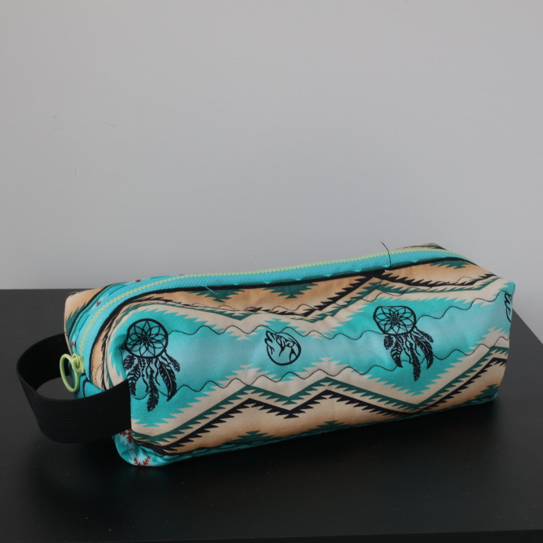 Teal cotton fabric with wolf and dreamcatcher silhouette patterns, sewn into a cosmetic case. Featuring a zipper closure and elastic carry handle.