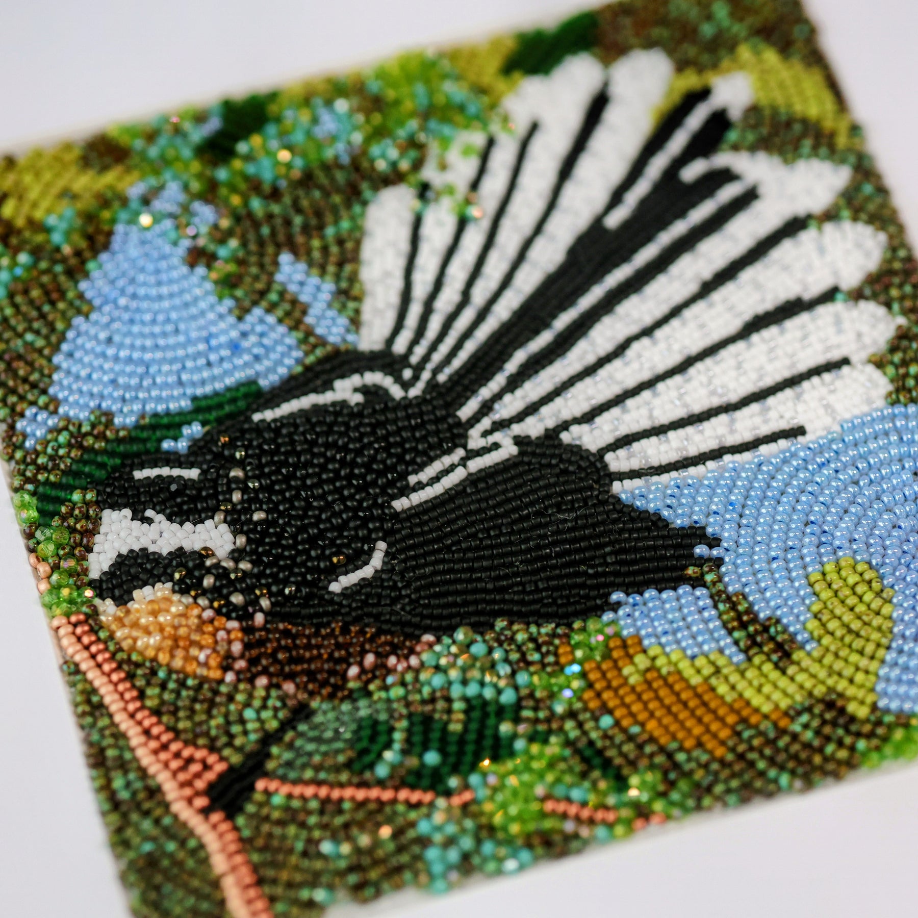 "Beaded image of a Fantail or Pīeakawaka (Maori) inspired from a recent trip to Aotearoa (New Zealand). I used a mixture of size 15 Toho beads, size 10 seed beads, and rhondelle beads to add texture. Fantails are culturally recognized as a messenger from the gods."