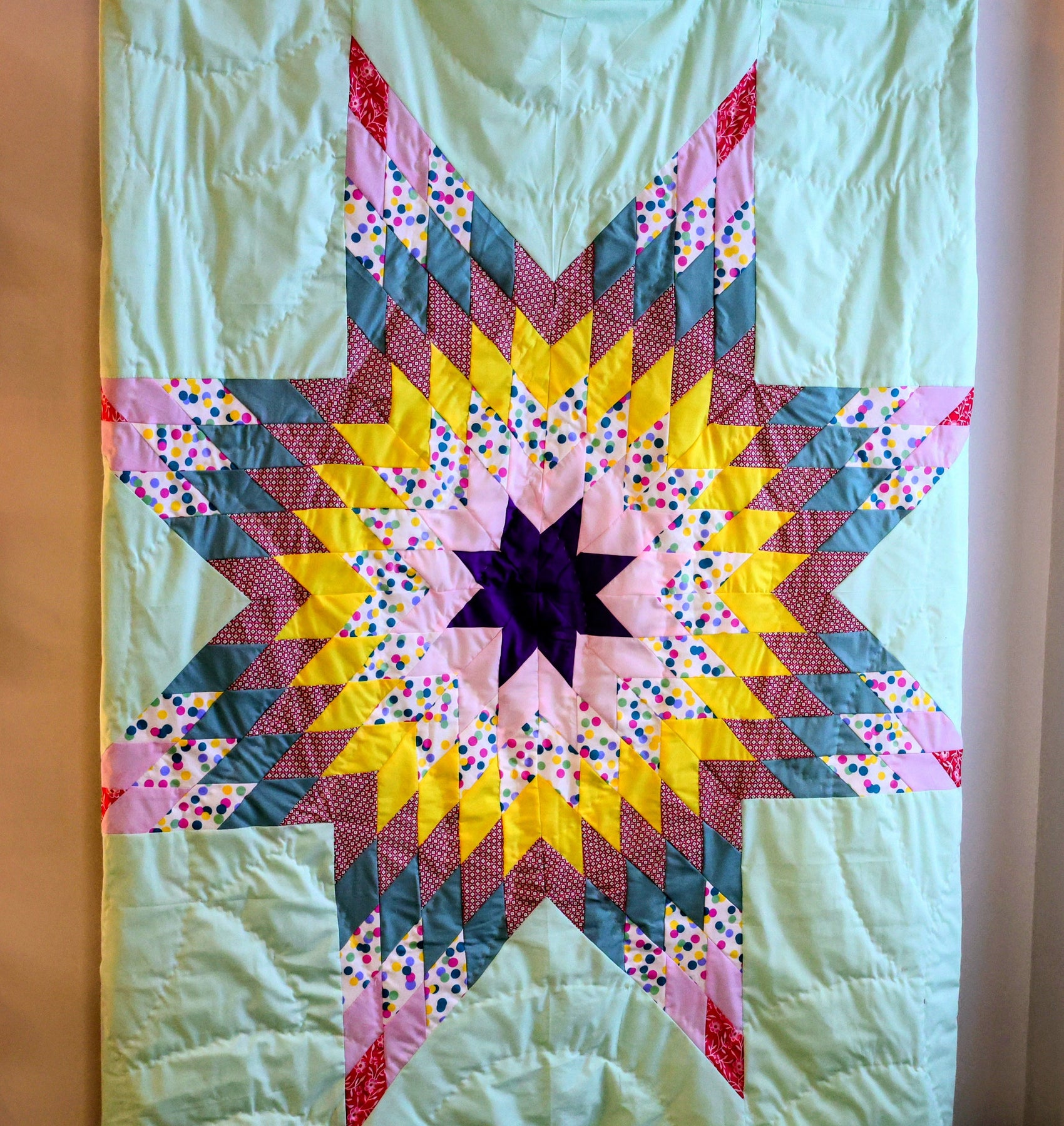 Queen sized quilt featuring beautiful colours & intricate hand stitching. The artist calls this the bubblegum blanket, inspired by pastel tones and sweet polkadot accents that create the star pattern, finished with a bright pink edge.