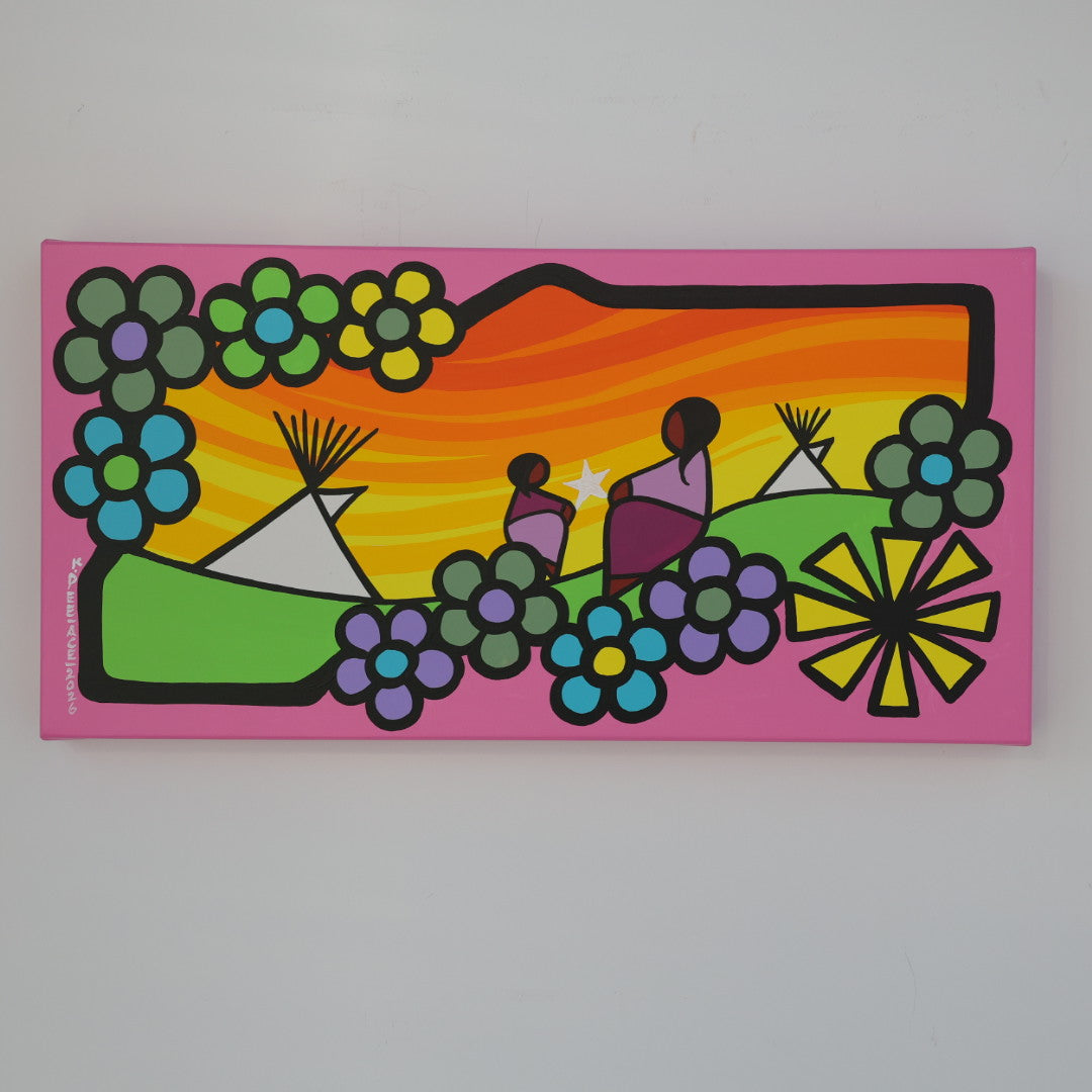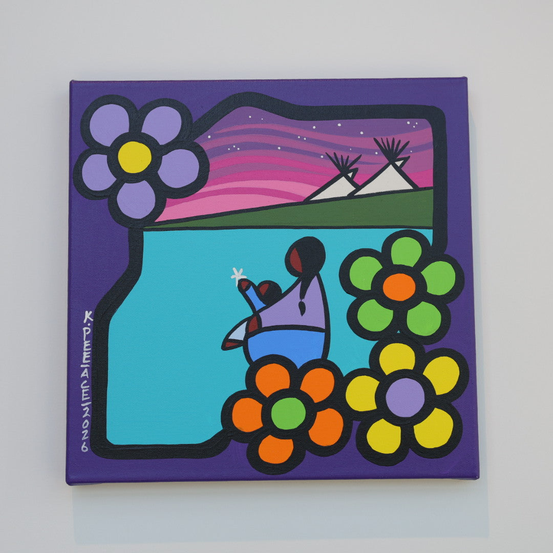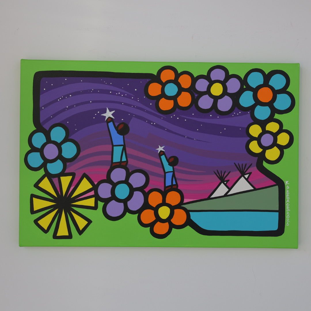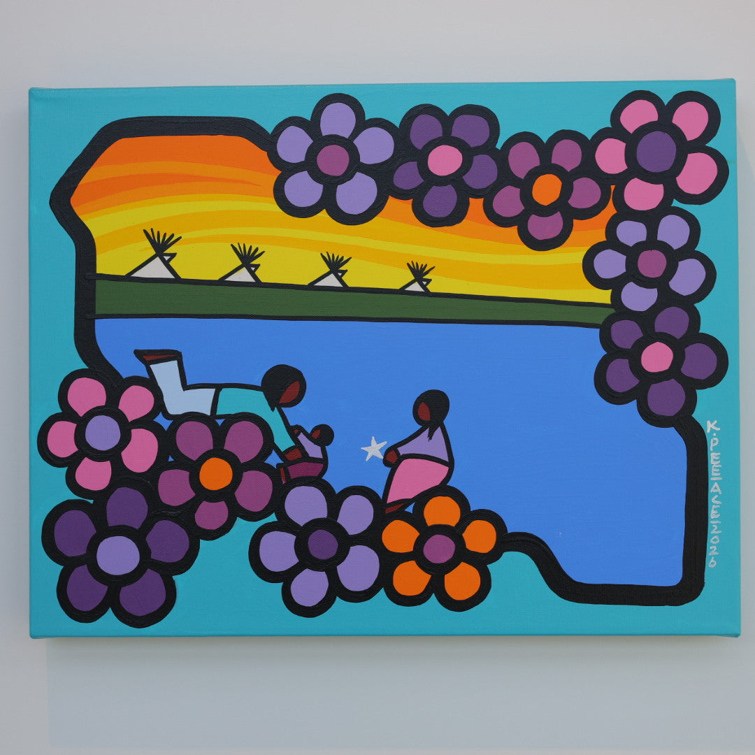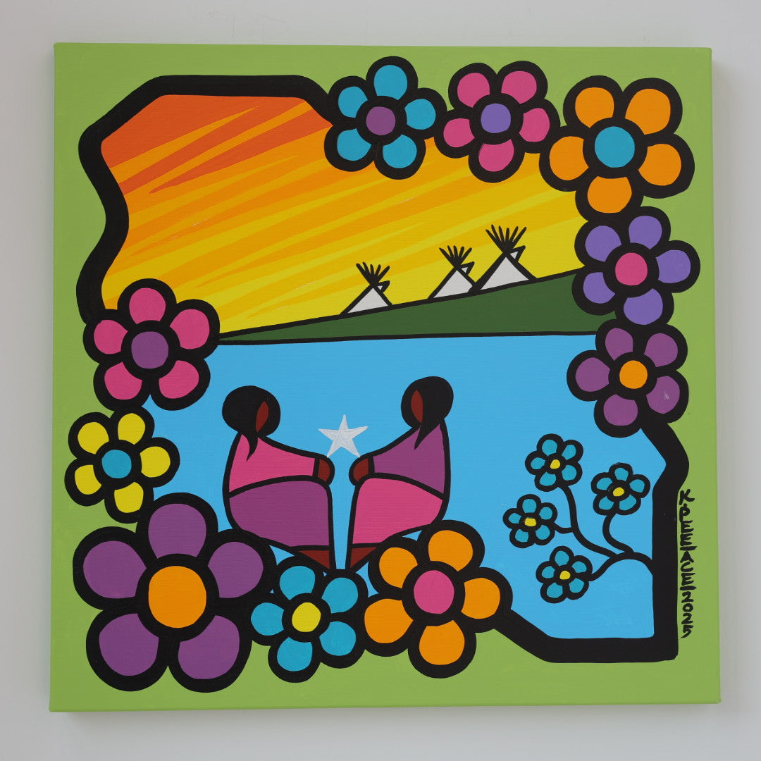 Through his style of painting, Kevin has been able to do collaborative mural projects with various schools throughout Saskatchewan. He has also participated in the Northern Saskatchewan International Children's Festival the past couple of years where he has showcased in the First Peoples Village. The success of the "floral-children" style recently captured second place in the Annual Peace Hills Art Contest for 2003.