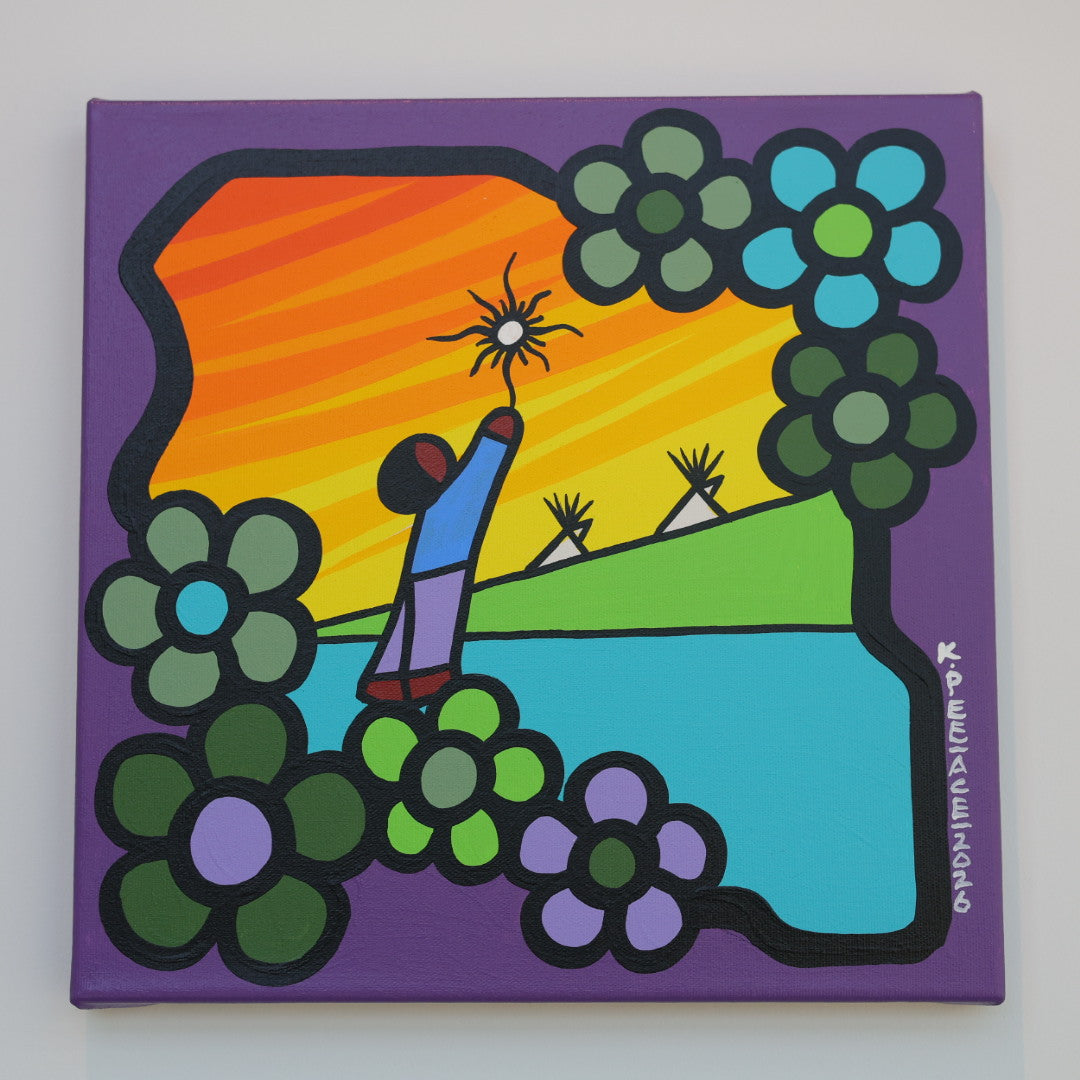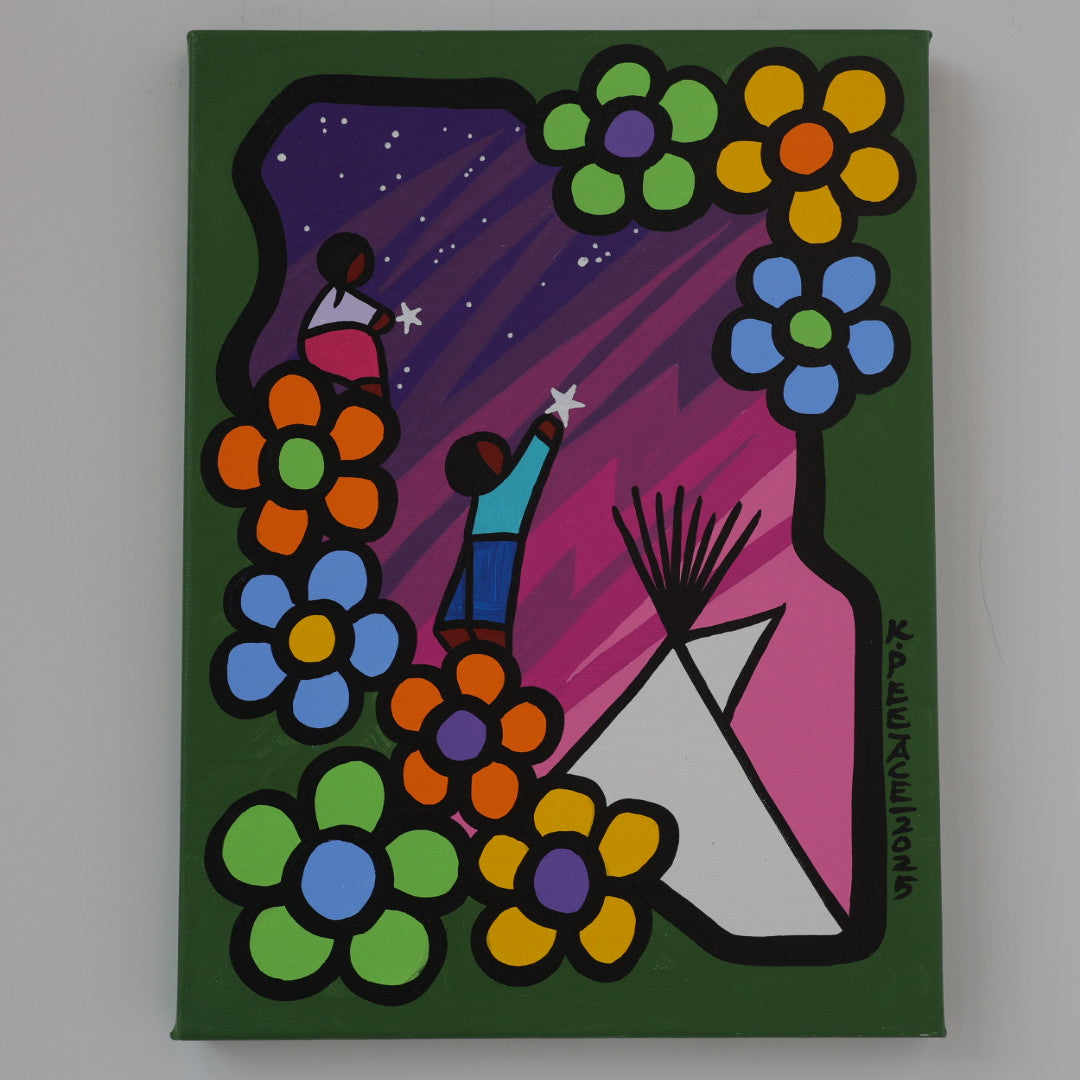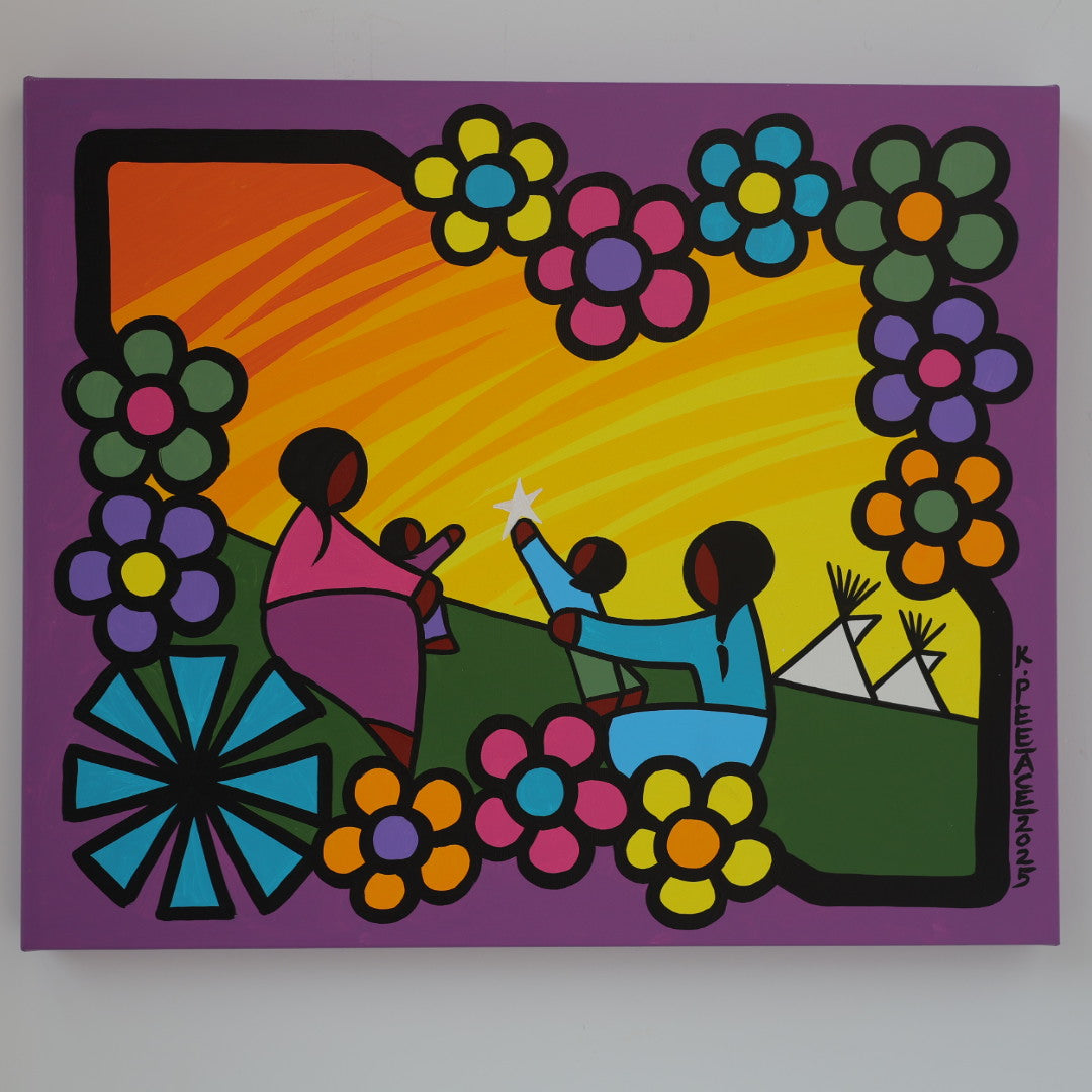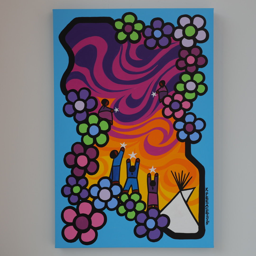 Through his style of painting, Kevin has been able to do collaborative mural projects with various schools throughout Saskatchewan. He has also participated in the Northern Saskatchewan International Children's Festival the past couple of years where he has showcased in the First Peoples Village. The success of the "floral-children" style recently captured second place in the Annual Peace Hills Art Contest for 2003.