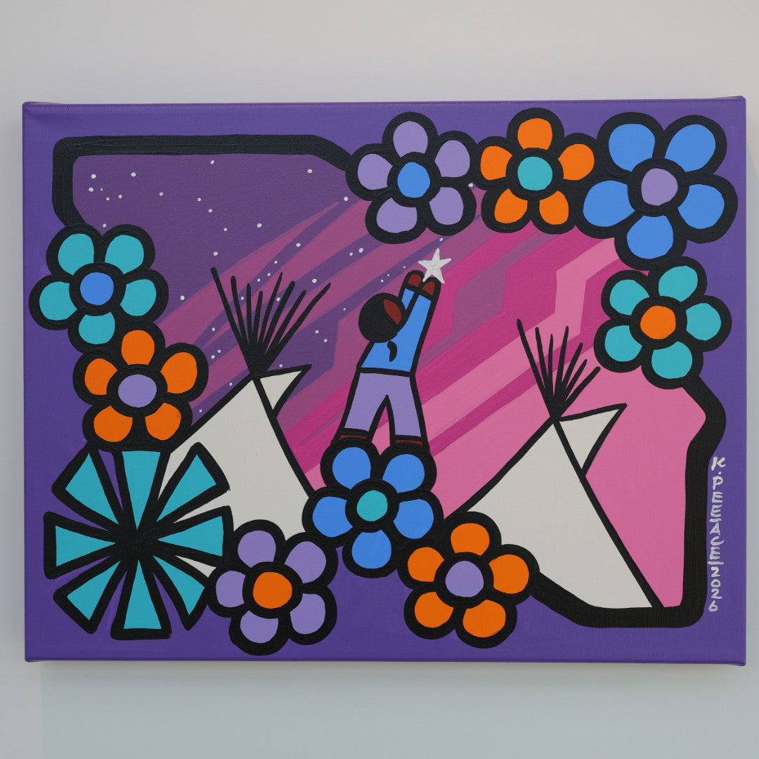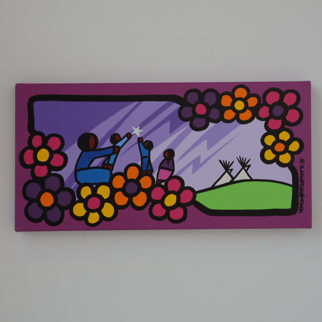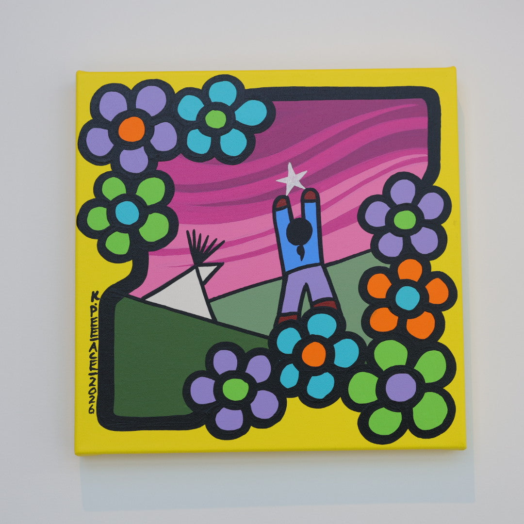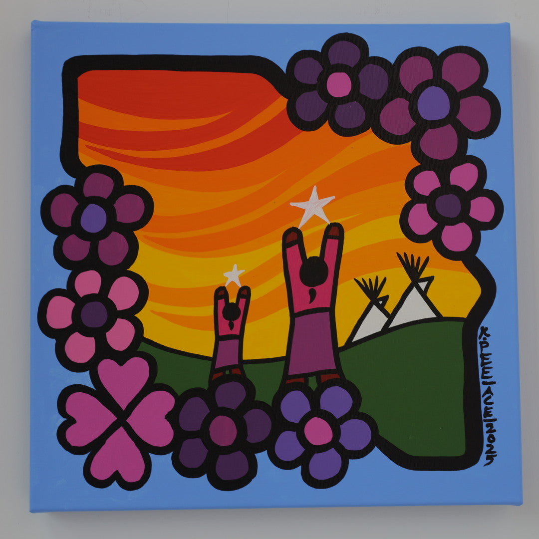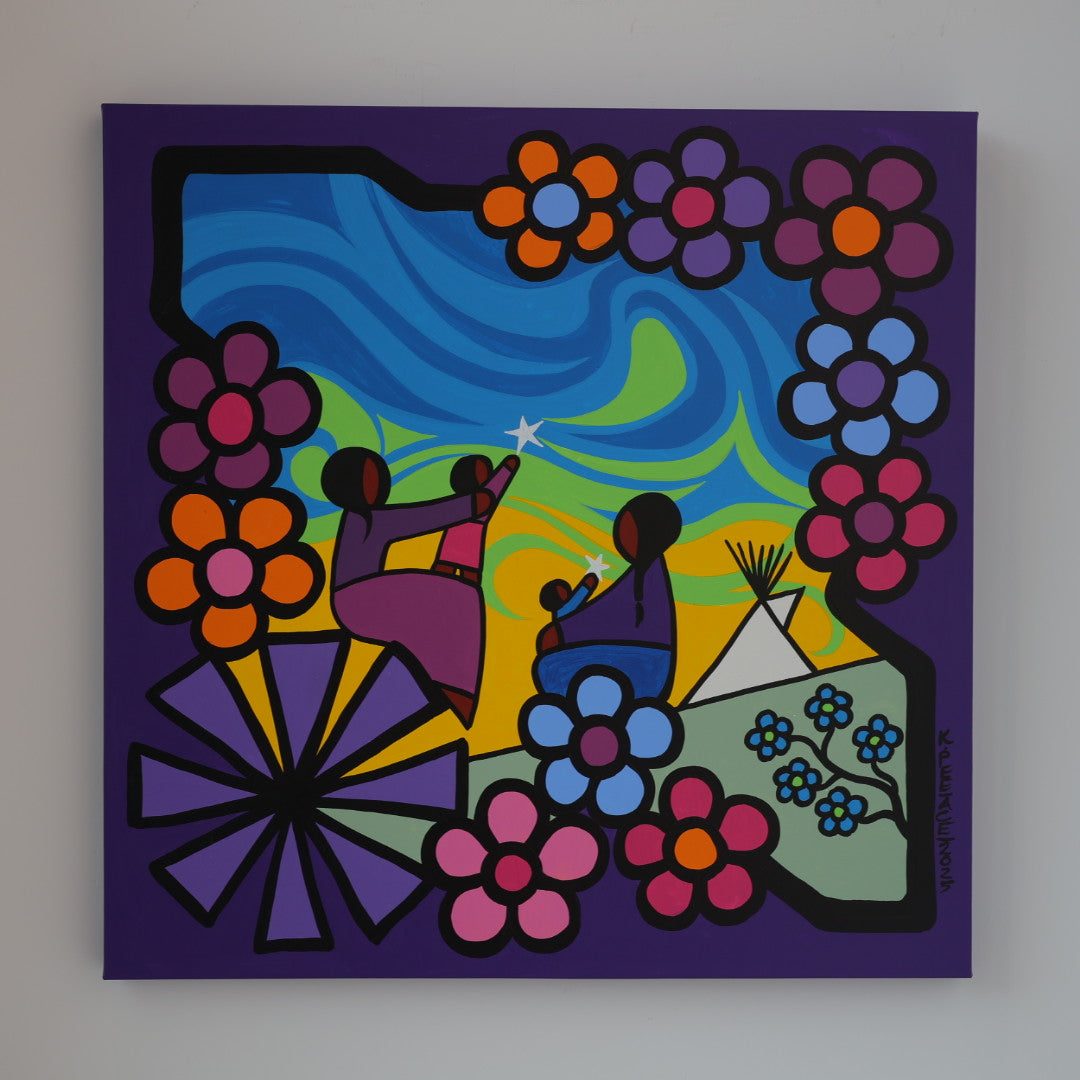 Through his style of painting, Kevin has been able to do collaborative mural projects with various schools throughout Saskatchewan. He has also participated in the Northern Saskatchewan International Children's Festival the past couple of years where he has showcased in the First Peoples Village. The success of the "floral-children" style recently captured second place in the Annual Peace Hills Art Contest for 2003.