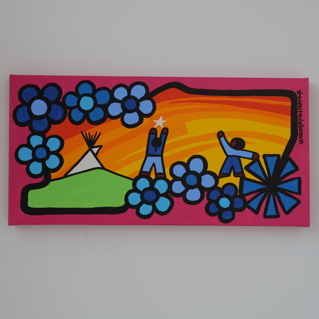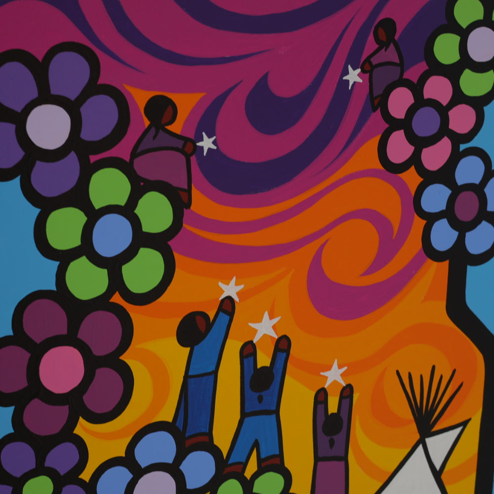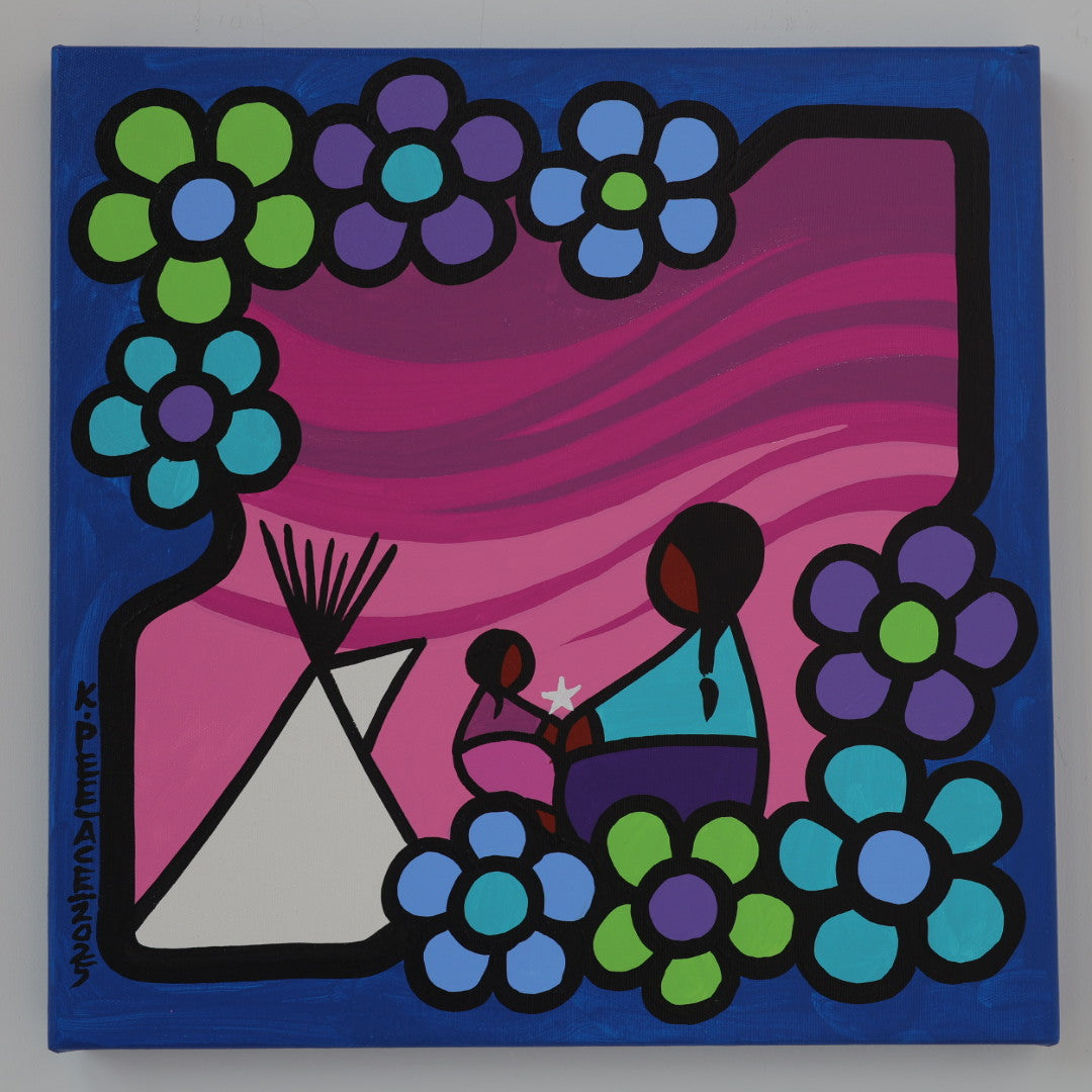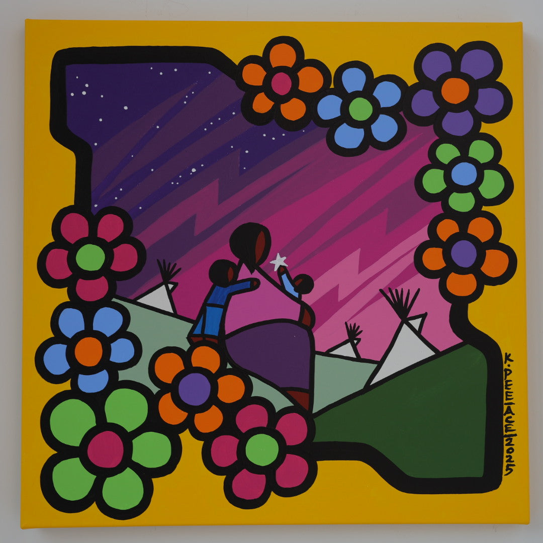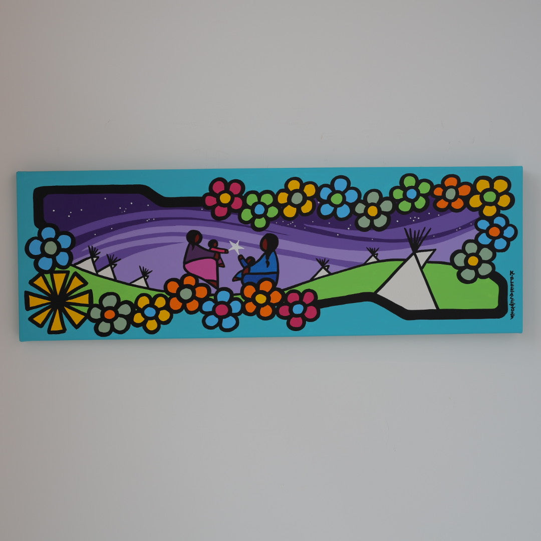 Through his style of painting, Kevin has been able to do collaborative mural projects with various schools throughout Saskatchewan. He has also participated in the Northern Saskatchewan International Children's Festival the past couple of years where he has showcased in the First Peoples Village. The success of the "floral-children" style recently captured second place in the Annual Peace Hills Art Contest for 2003.