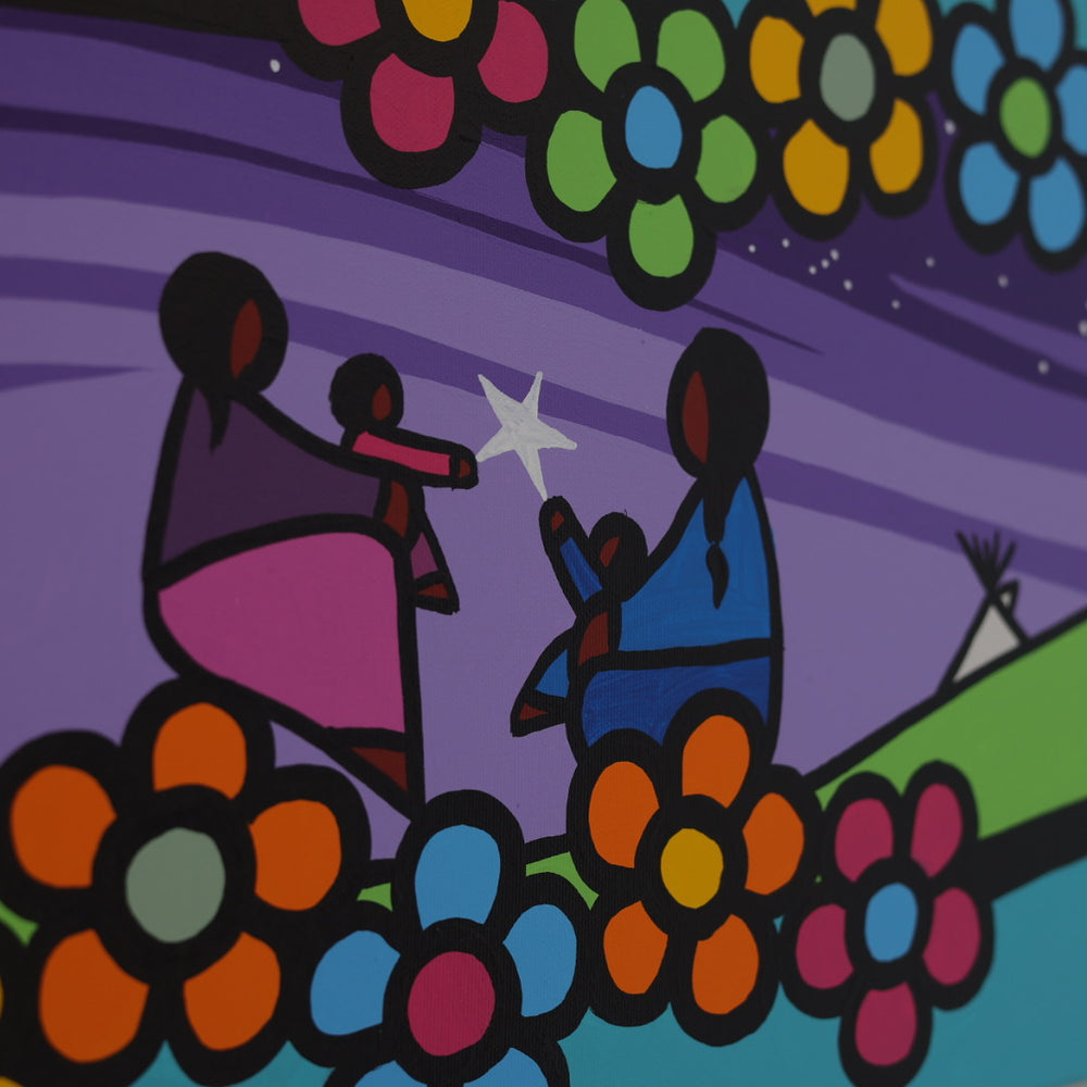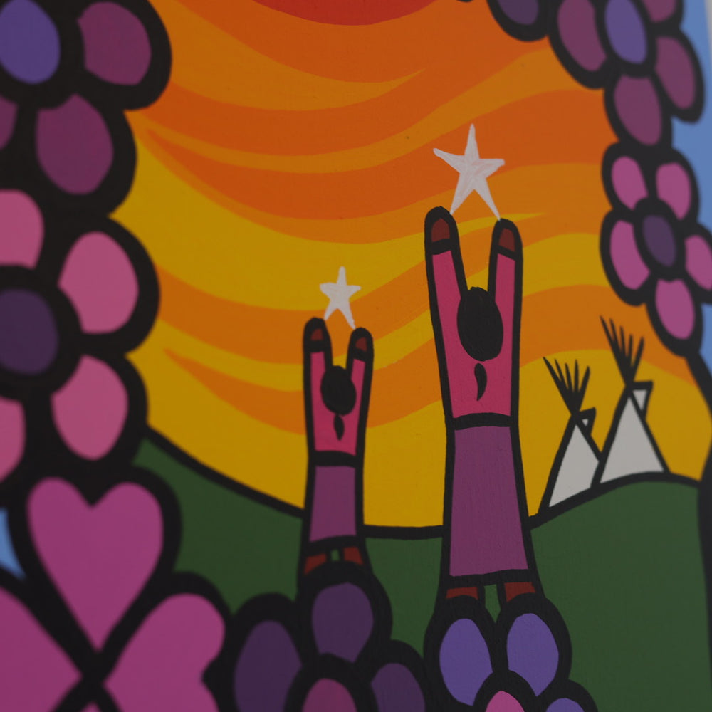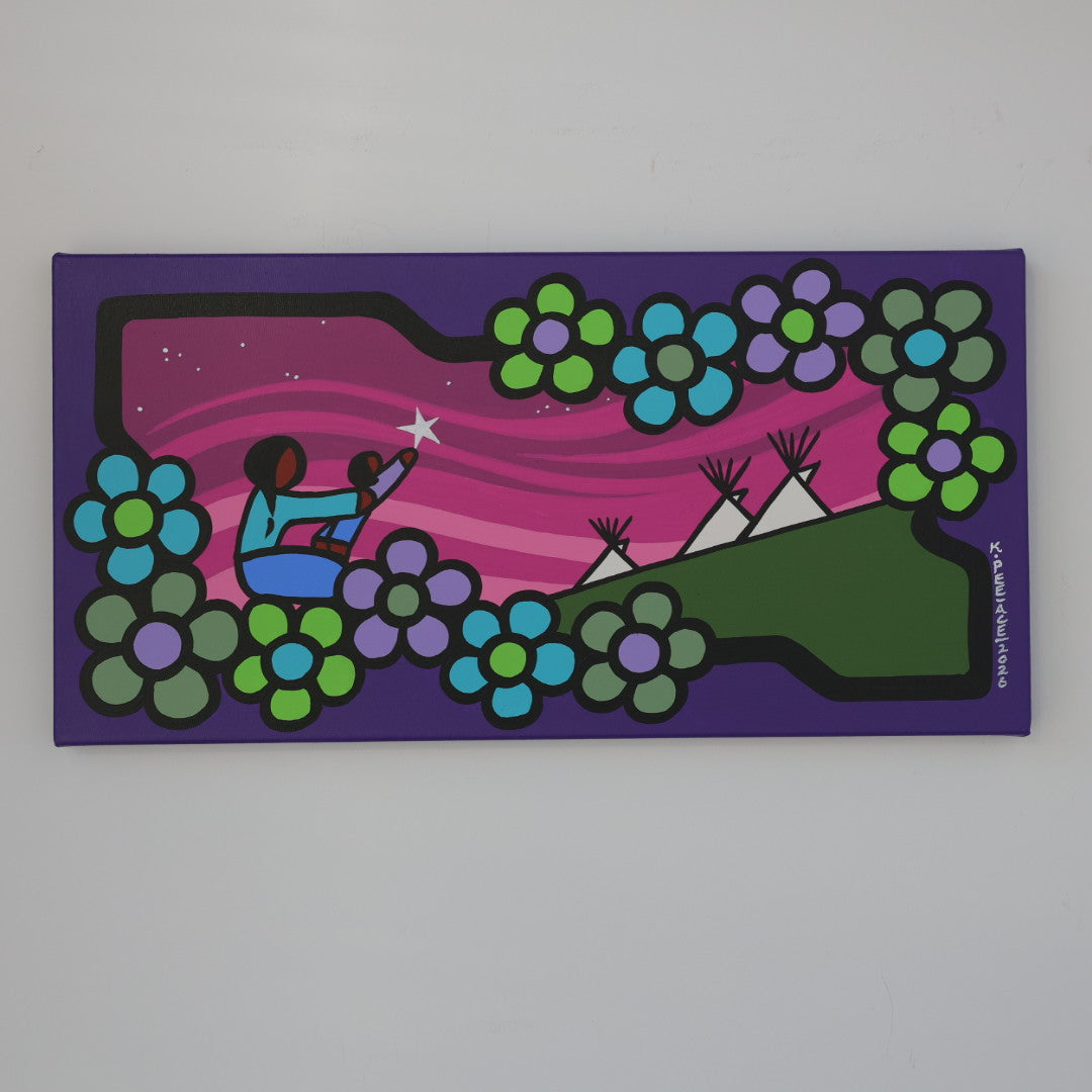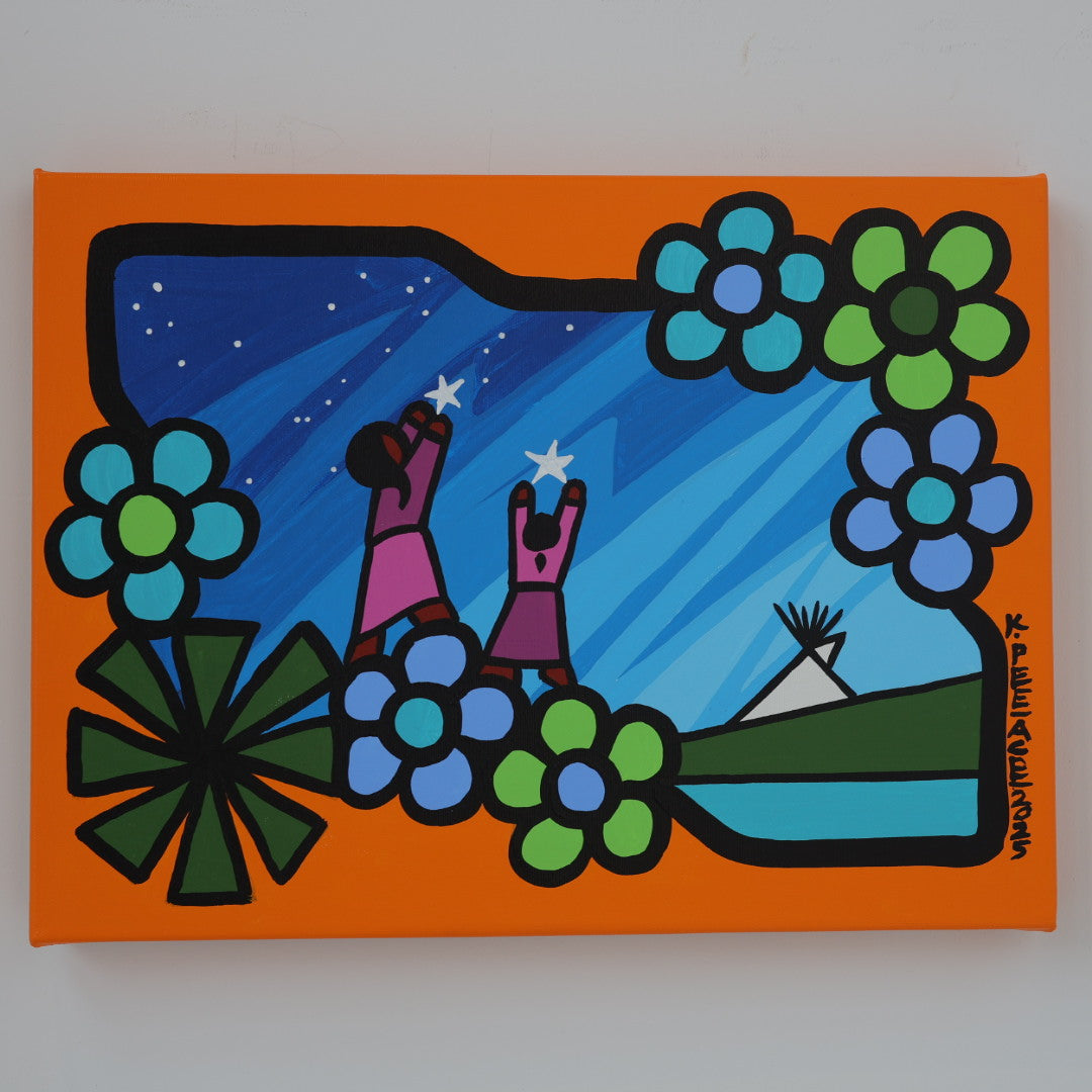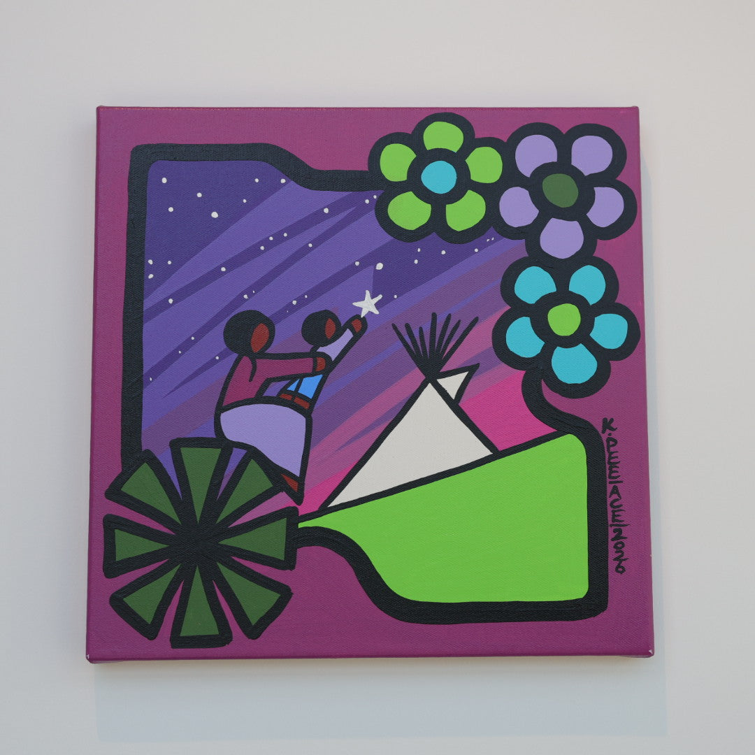 Through his style of painting, Kevin has been able to do collaborative mural projects with various schools throughout Saskatchewan. He has also participated in the Northern Saskatchewan International Children's Festival the past couple of years where he has showcased in the First Peoples Village. The success of the "floral-children" style recently captured second place in the Annual Peace Hills Art Contest for 2003.