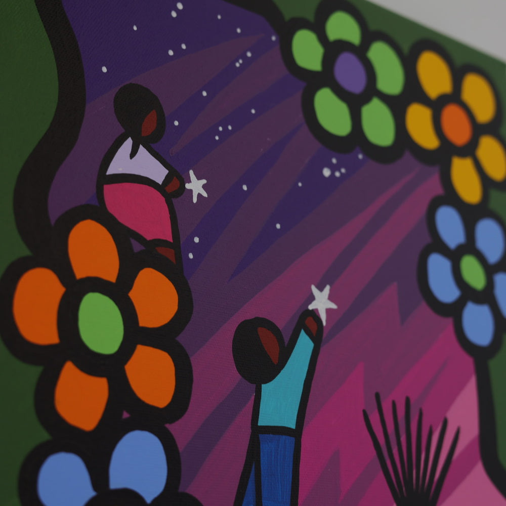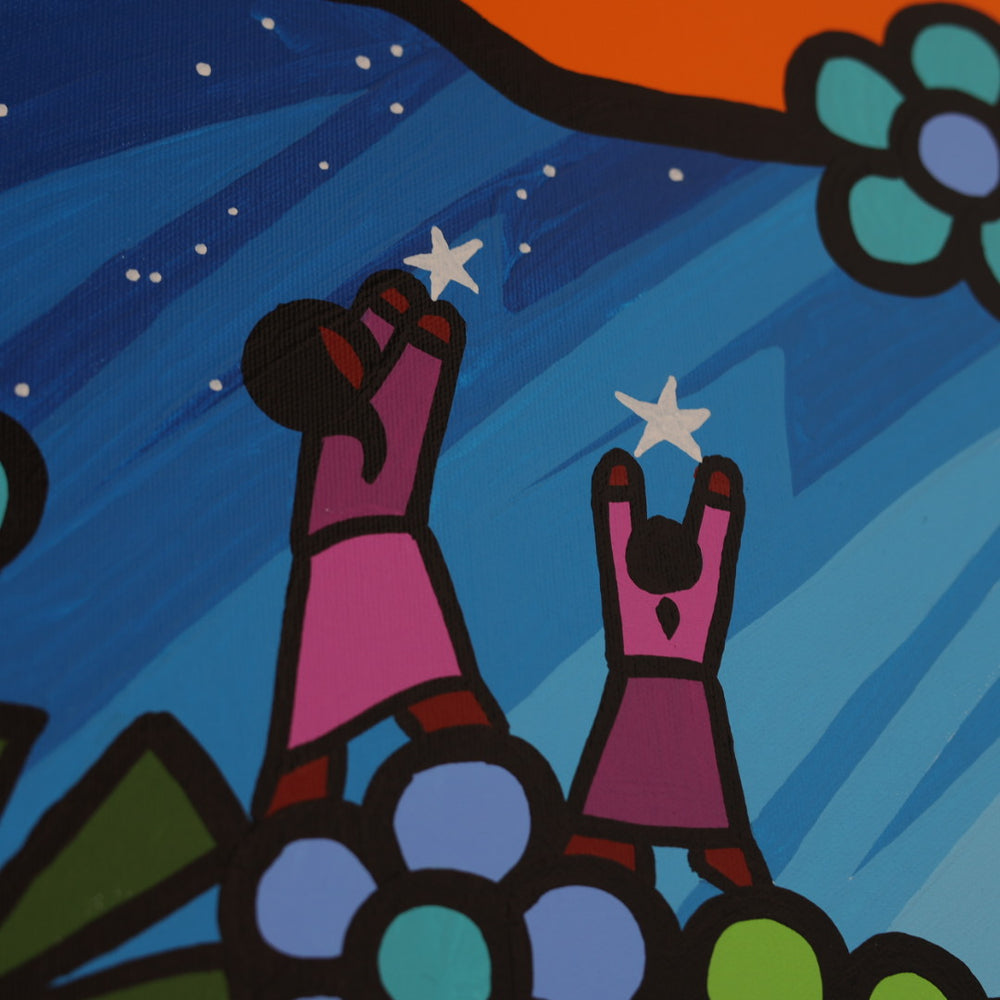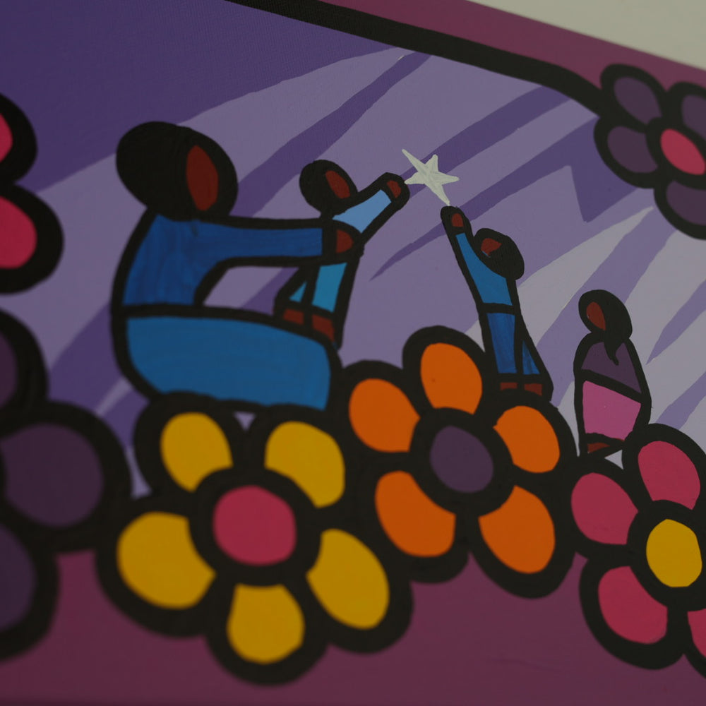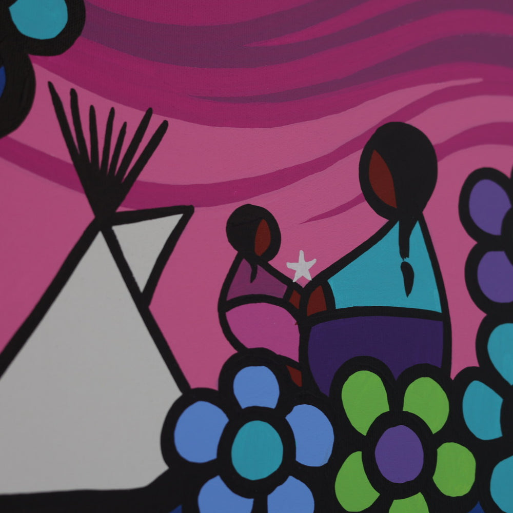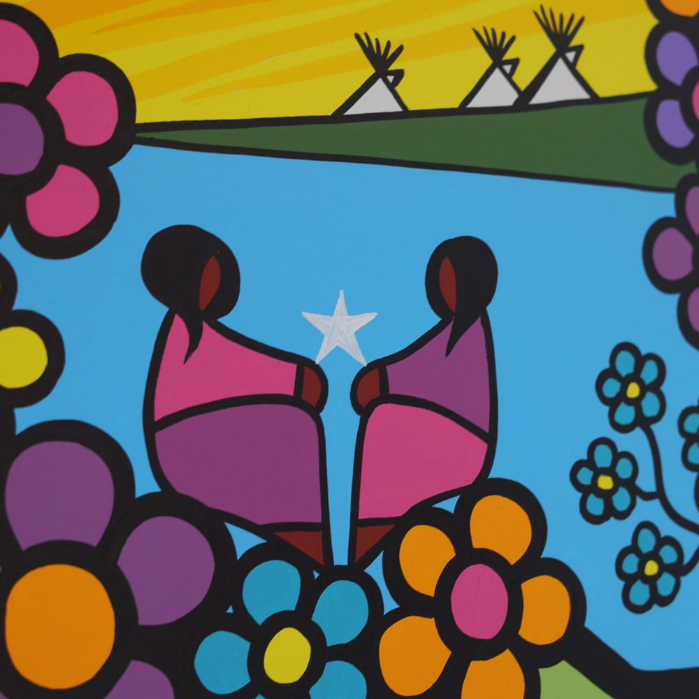 Through his style of painting, Kevin has been able to do collaborative mural projects with various schools throughout Saskatchewan. He has also participated in the Northern Saskatchewan International Children's Festival the past couple of years where he has showcased in the First Peoples Village. The success of the "floral-children" style recently captured second place in the Annual Peace Hills Art Contest for 2003.