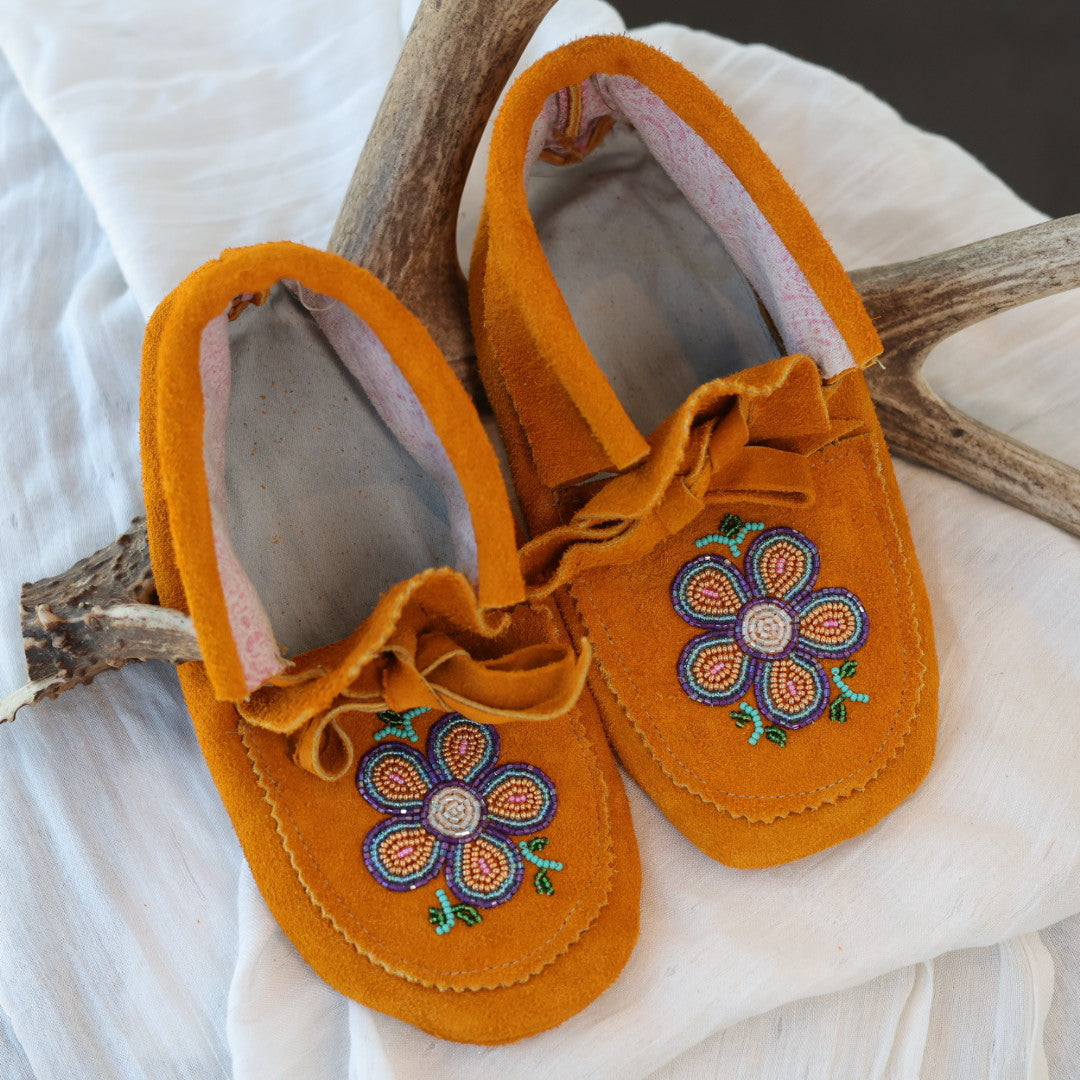 Crafted from processed deer hide, lightly lined with a flannel fabric and denim inner sole for comfort and durability. Featuring a gold and purple beaded 5-petal floral design on the vamp and an ankle tie closure.