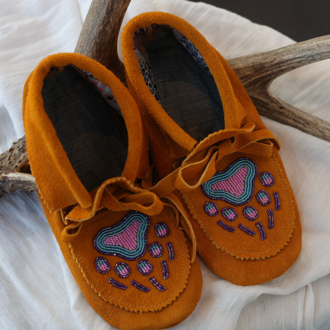 Crafted from processed deer hide, lightly lined with a flannel fabric and denim inner sole for comfort and durability. Featuring a beaded bear paw design on the vamp and an ankle tie closure.