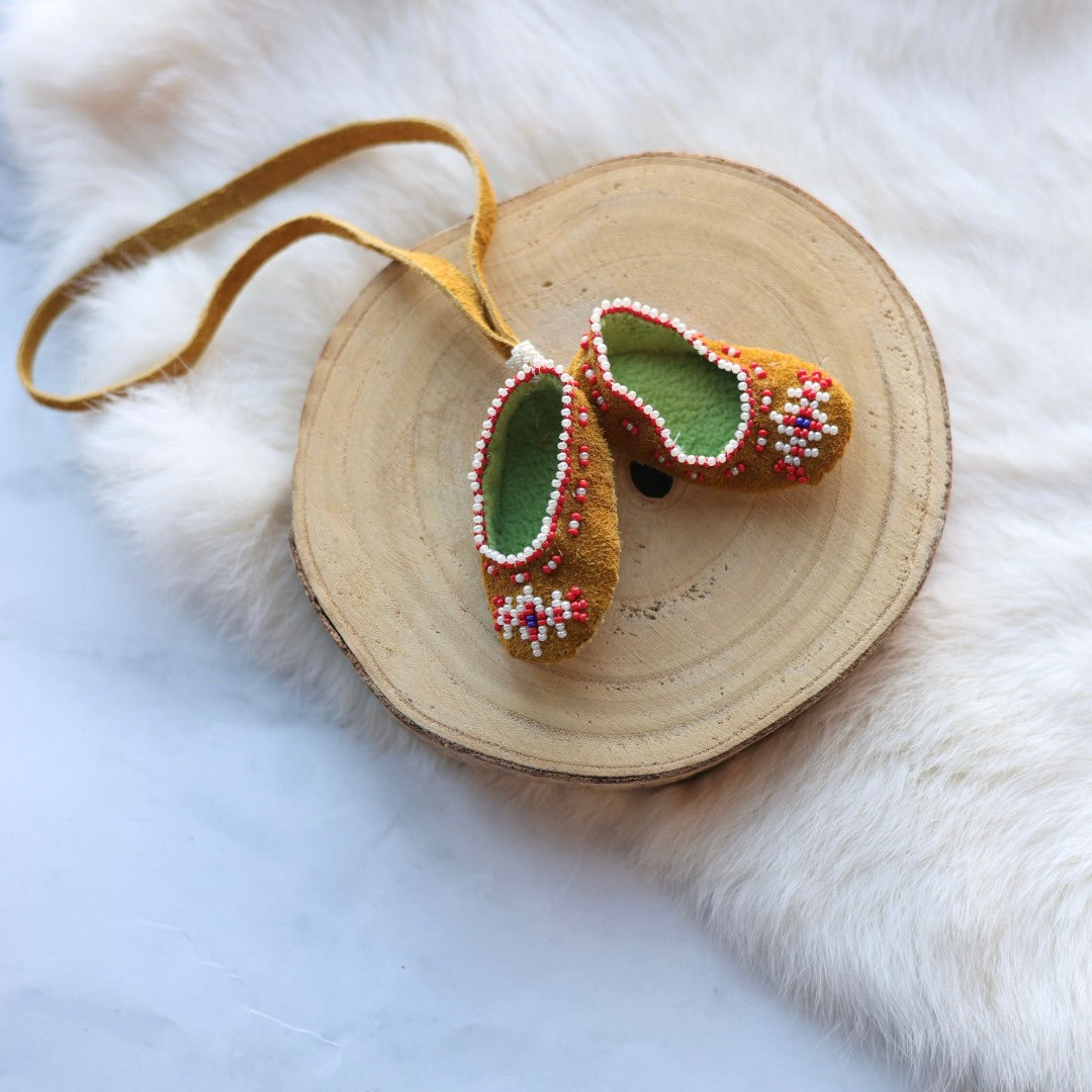 Made from the scraps of her moccasin sewing, these miniature hide moccasins by T. Sullivan are a cute and heartwarming decoration to hang from your cars rear view mirror.
