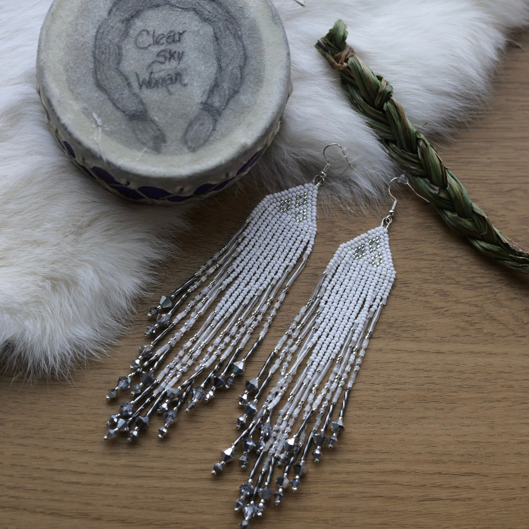 Shimmery fringe earrings by Lillian S. of Fishing Lake First Nation.