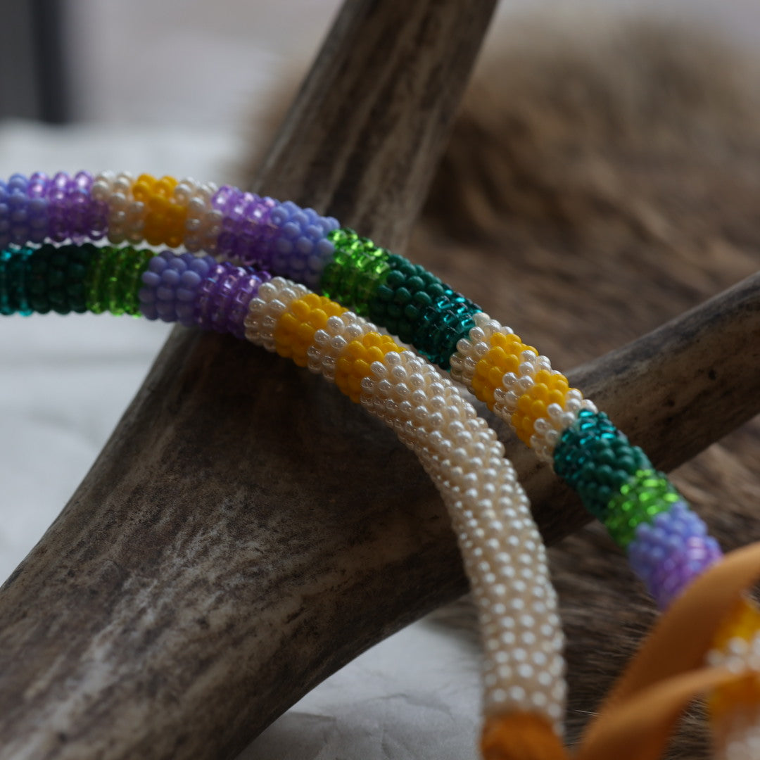 5"x3.5" medallion pendant, beaded with colourful size 11 glass seed beads in a floral design. Pendant backed with faux leather and complete on a 24" wrap-style beaded neck chain with a ribbon tie for adjustable wear.