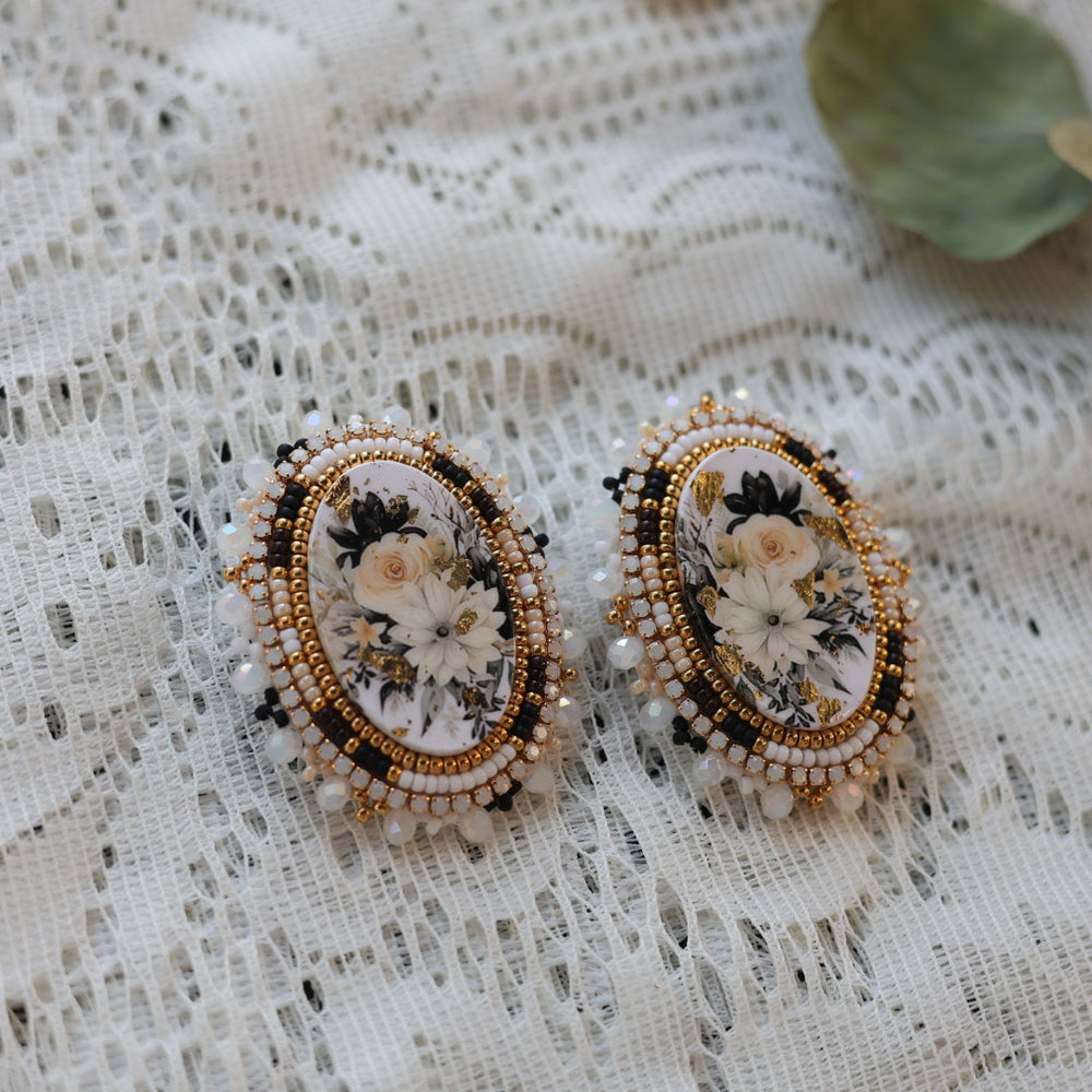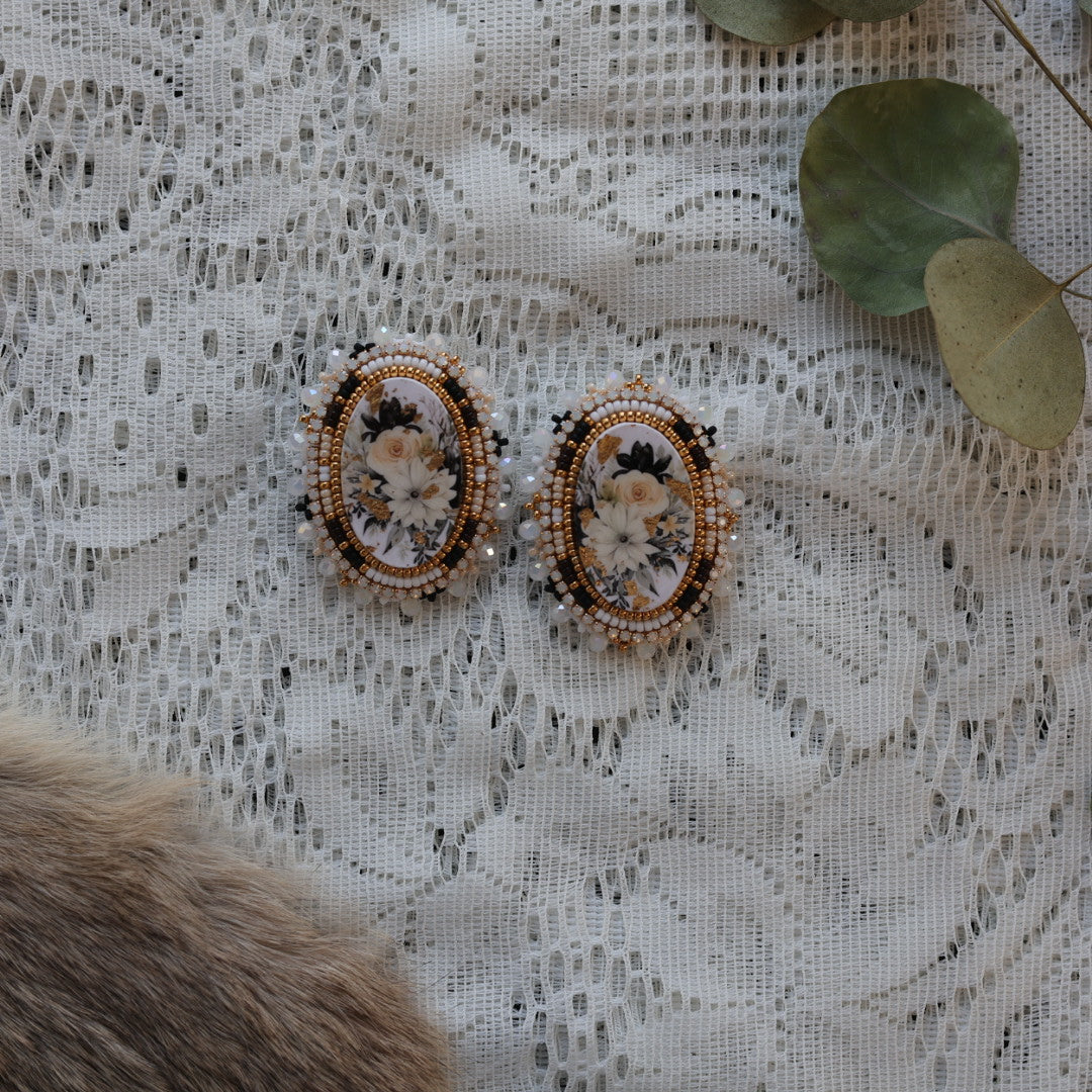 Prairie Sage Beadwork Cream Floral Cab Beaded Earrings