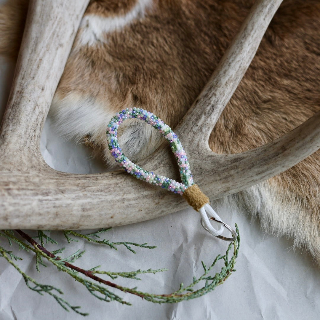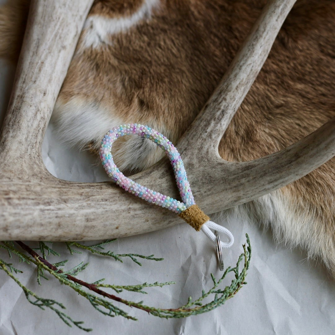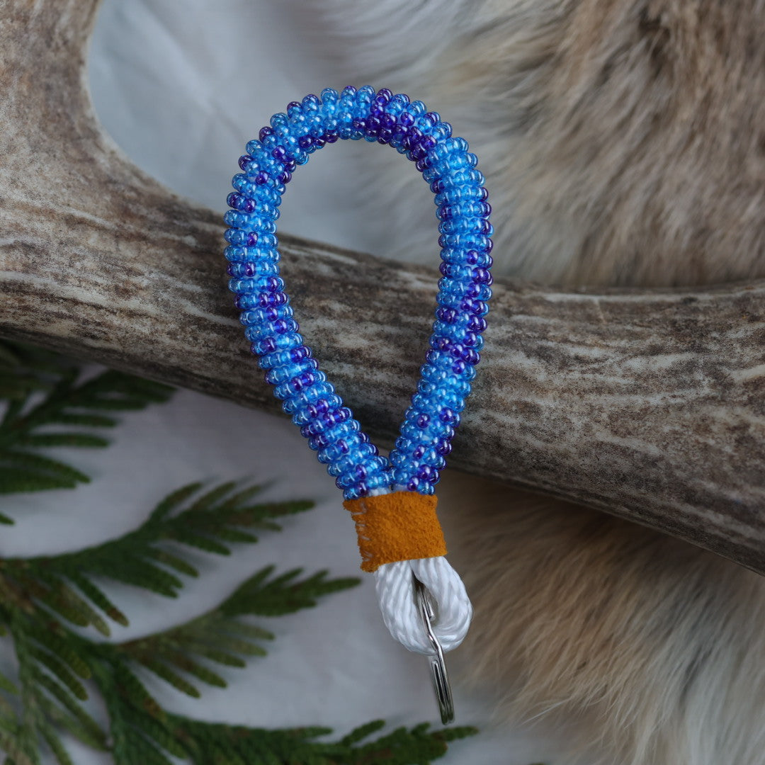3" finger lanyards beaded with size 11 seed beads with a wrapping technique. Finished with hide and a key ring. Colours and patterns may vary!