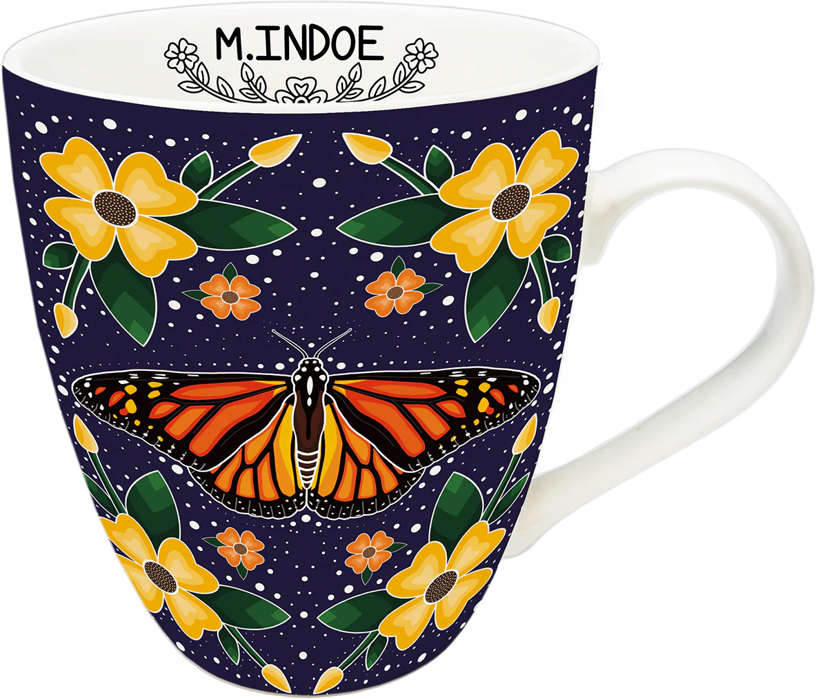 Monarch Butterfly mug by artist Marissa Indoe. Her cultural background is Chapleau Ojibwe First Nation, Anishinaabe, Ontario. The artist is paid a royalty on every sale.