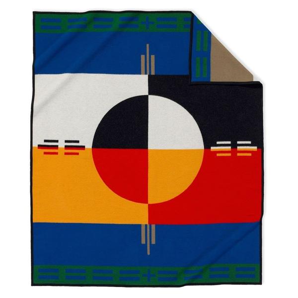 This design pays respect to tribal elders, the wisdom keepers who hand down teachings and spiritual direction to children and future generations. Their guidance gives children a better understanding of their responsibility to the universe and the creator, and that all things are interrelated and an equal part of the whole. All colors of humankind, the color of Mother Earth, the sun and other circular celestial bodies and the four directions of life are represented in this USA-made wool blanket. Part of our Legendary Collection, this design honors stories and symbols of Native American cultures. Each year a new USA-made collector's blanket is added to the series.