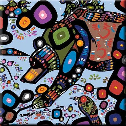 “Standing proud, he is the distance walker of the land and a swimmer from island to island. As the ancestors watch over the land and caring for all living things, the spirit rocks shine their colors.” - John Rombough