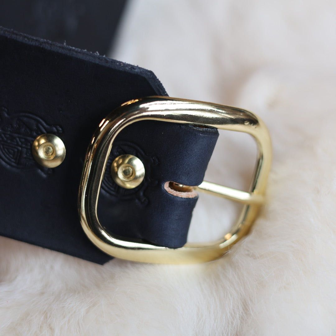 2.5" wide and adjustable from 32"-35". Crafted with high quality leather hand stamped with a turtle silhouette and stained black. Finished with a stainless steel belt buckle on adjustable straps.