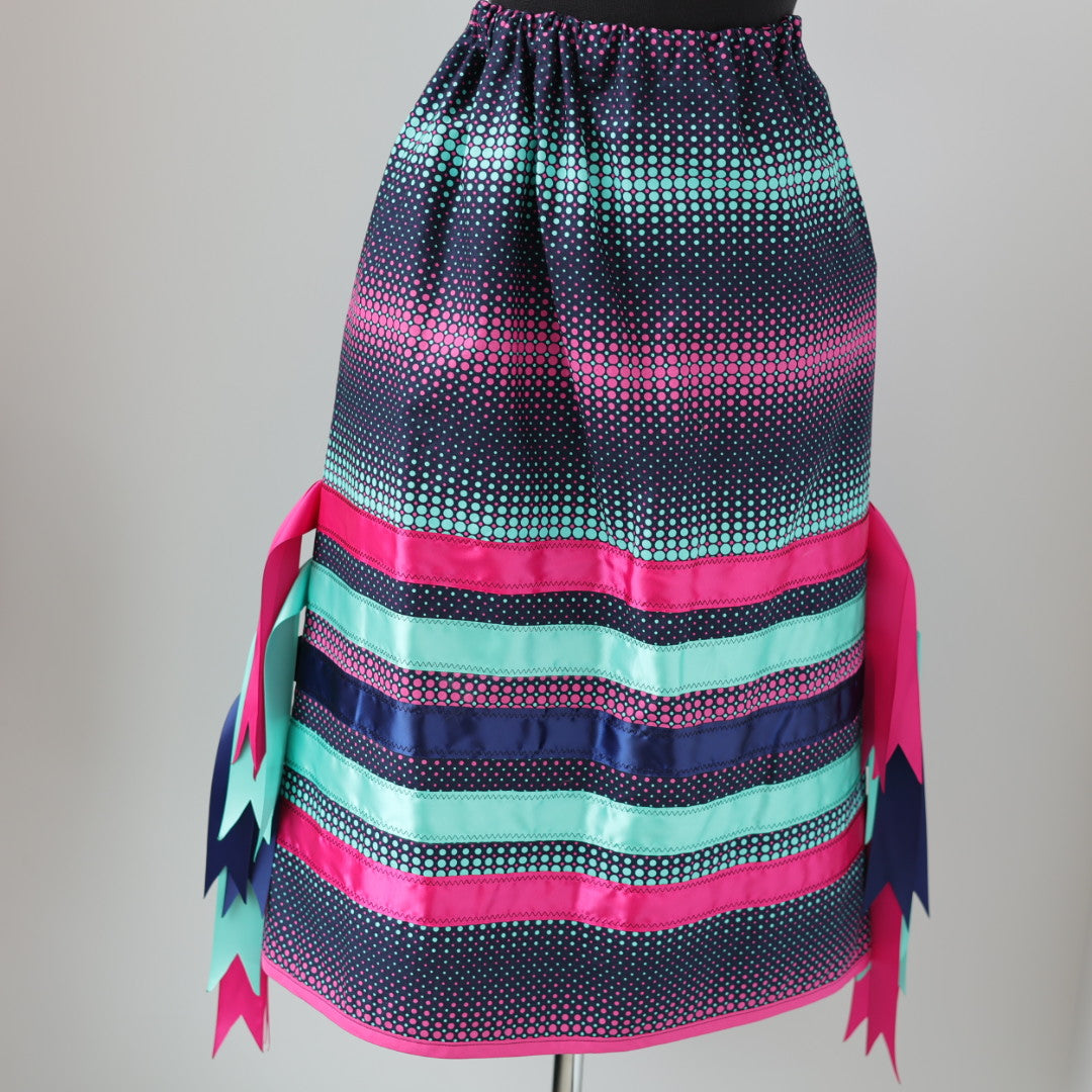 Vi's CREE-ations prides themselves on making Indigenous homemade clothing for all ages. Beautiful skirts sewn with quality fabrics, meticulous ribbon work, with a stretchy elastic waist and pockets!