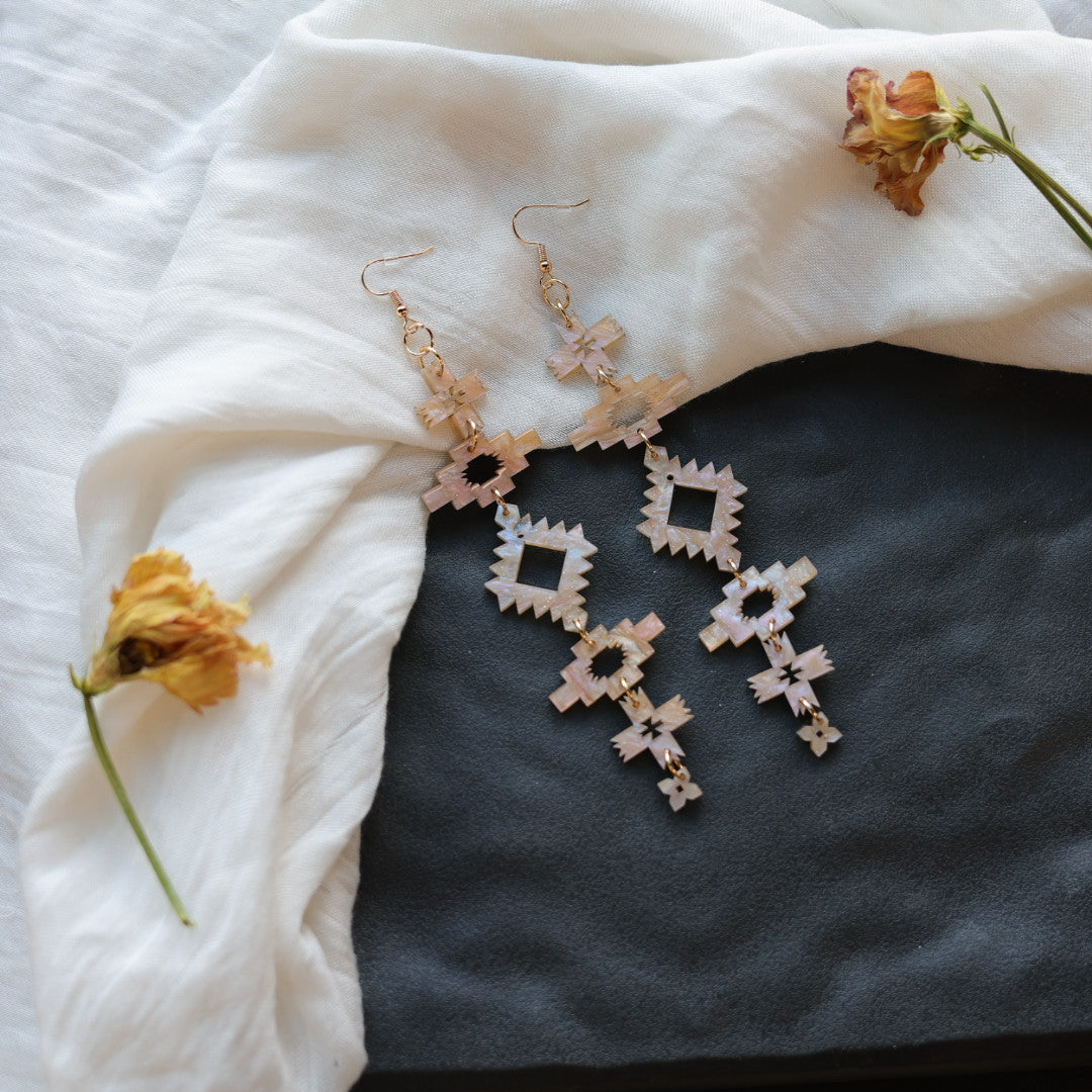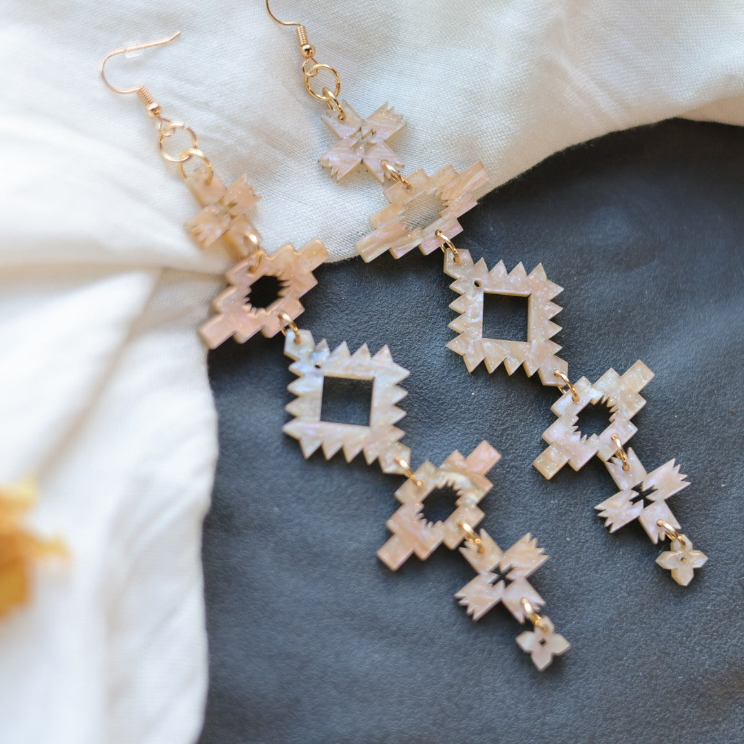 New design by Beth Rose Designs where they have used modern acrylic with an Aztec design. Coming in two different sizes the medium ones are 3” long and the large ones are 6” long, with gold plated findings.