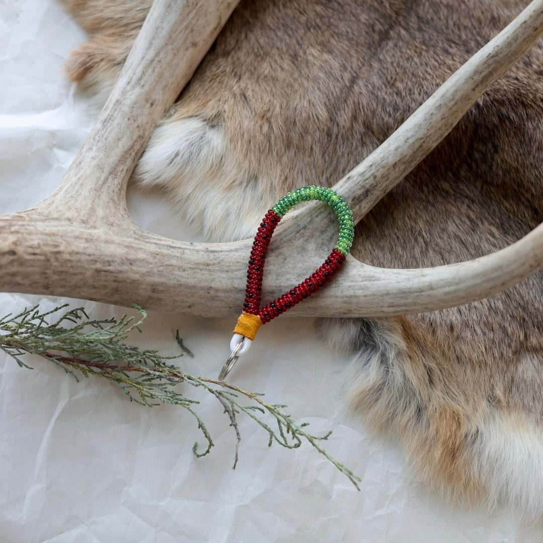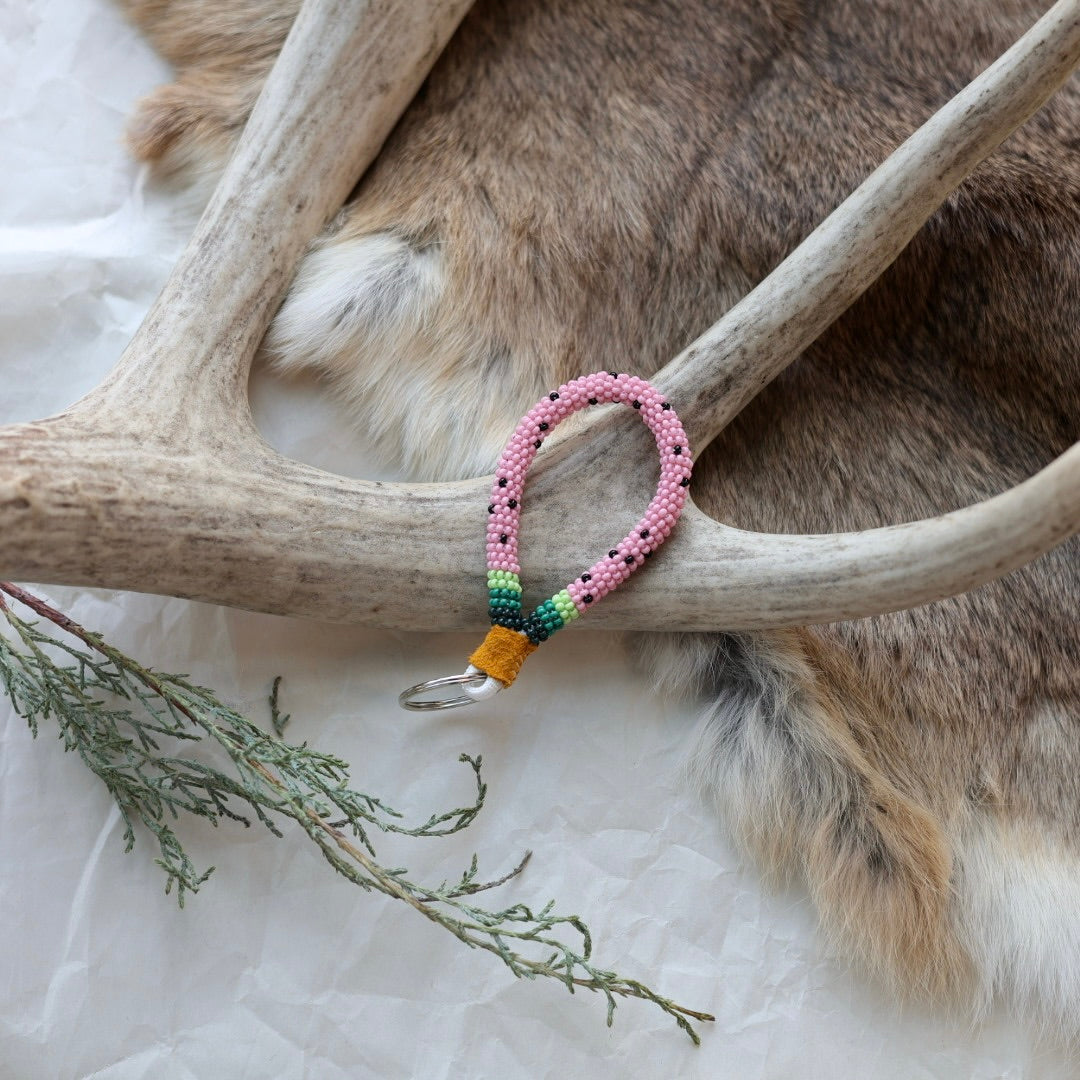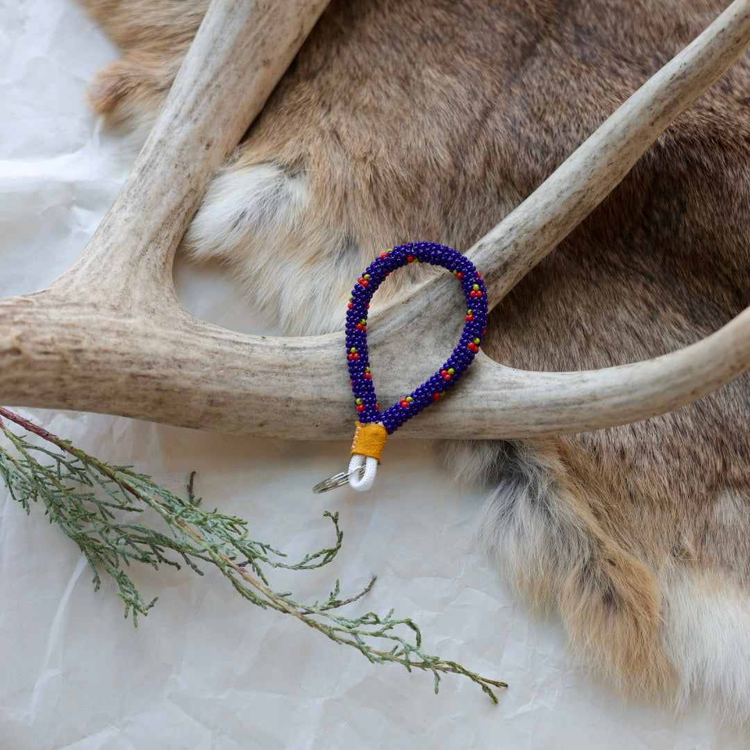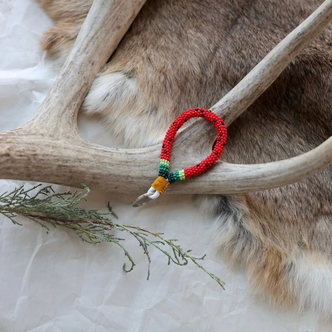 Beaded with size 11 seed beads in a wrap technique, complete with a hide finish and key ring. Colours and patterns may vary!
