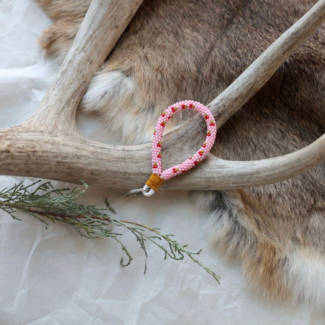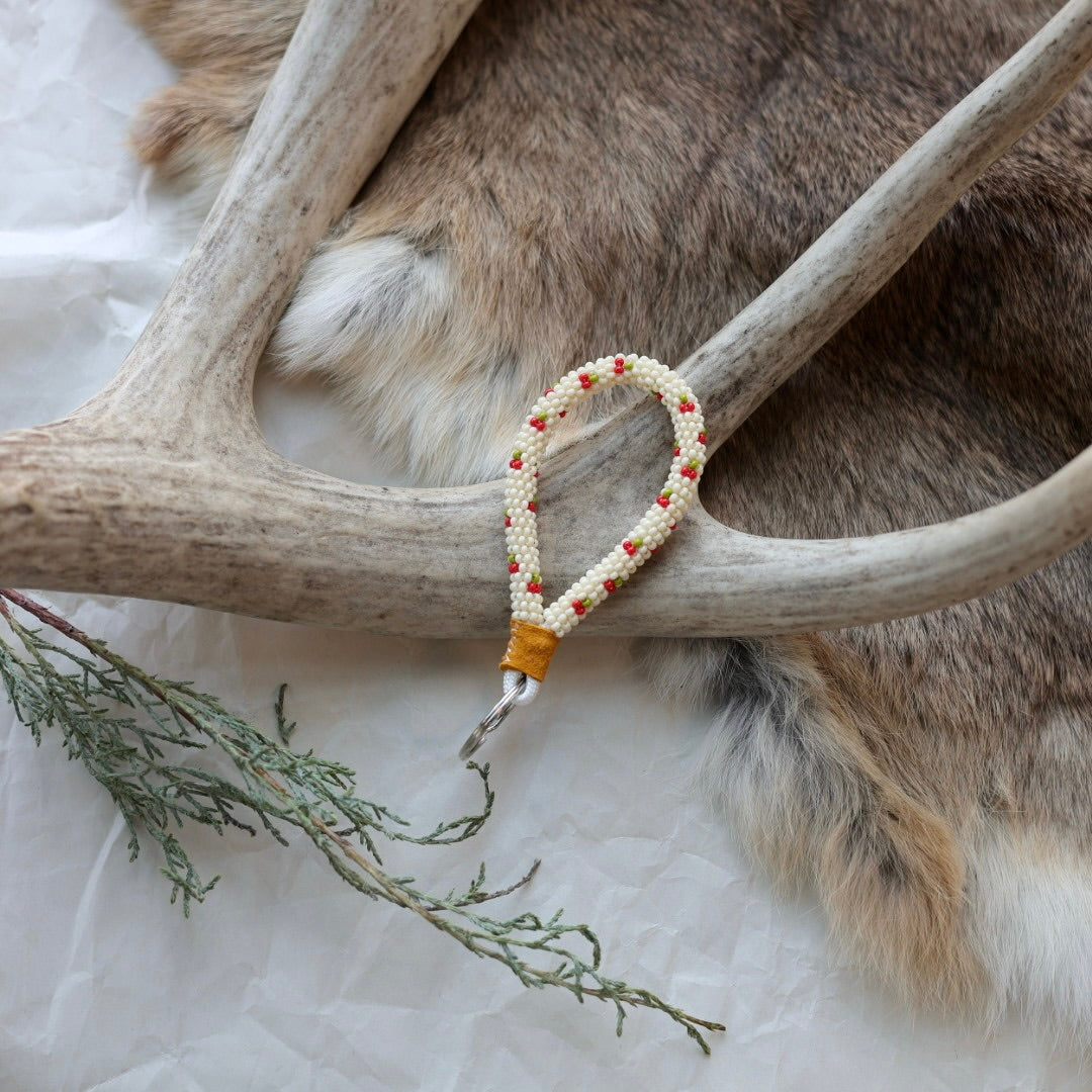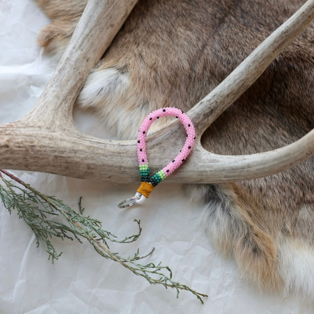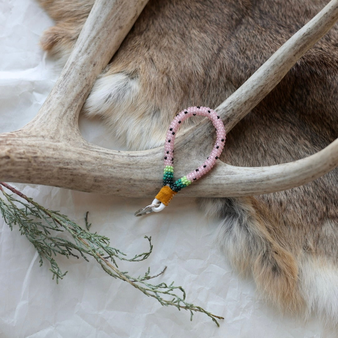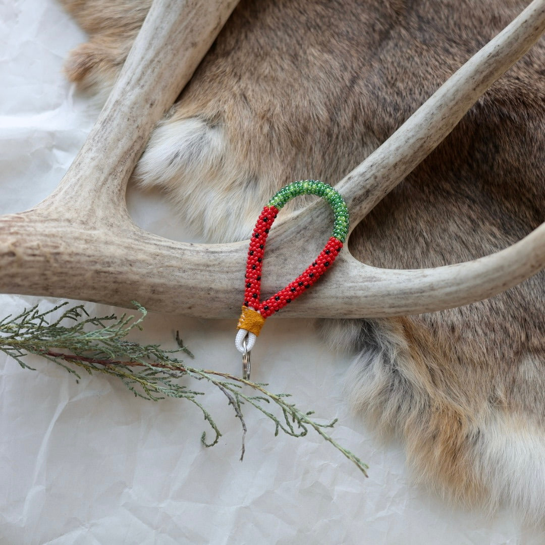 Beaded with size 11 seed beads in a wrap technique, complete with a hide finish and key ring. Colours and patterns may vary!