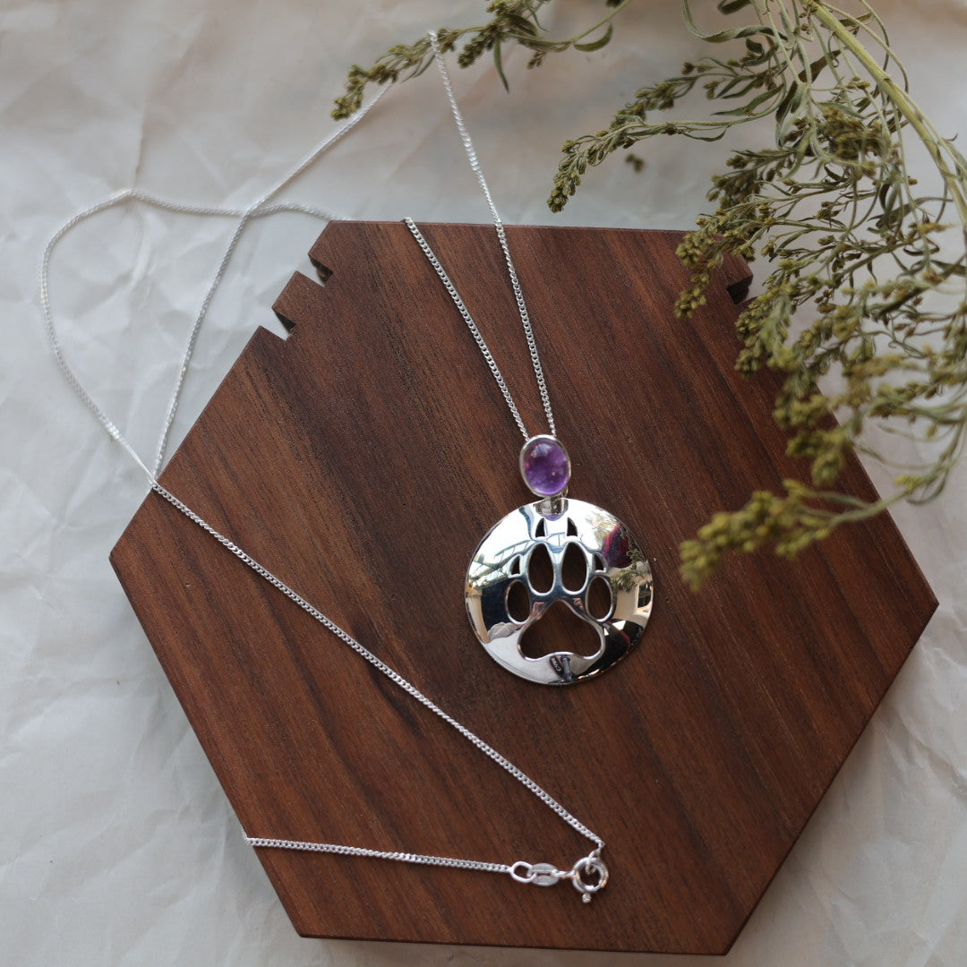 Sterling silver Wolf Paw cut out with inlay amethyst earrings and necklace.