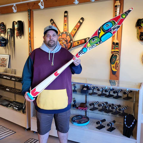 Adam Lewis, born in 1982 and raised in Cape Mudge Village (We Wai Kai) on Quadra Island, BC, is a Ligwilda’xw (Kwakwaka’wakw) artist whose journey began with an early fascination for the museum near his childhood home. Though surrounded by traditional formline art, his creativity initially drew him to street art, where he spent over 25 years painting murals with aerosol, honing his freehand technique, color use, and composition. In late 2021, Adam shifted his focus to learning and practicing traditional Kwakwaka’wakw art forms, largely teaching himself while blending contemporary approaches. Creating art has become both his passion and lifelong pursuit, and he continues to dedicate himself daily to producing meaningful, culturally rooted works.