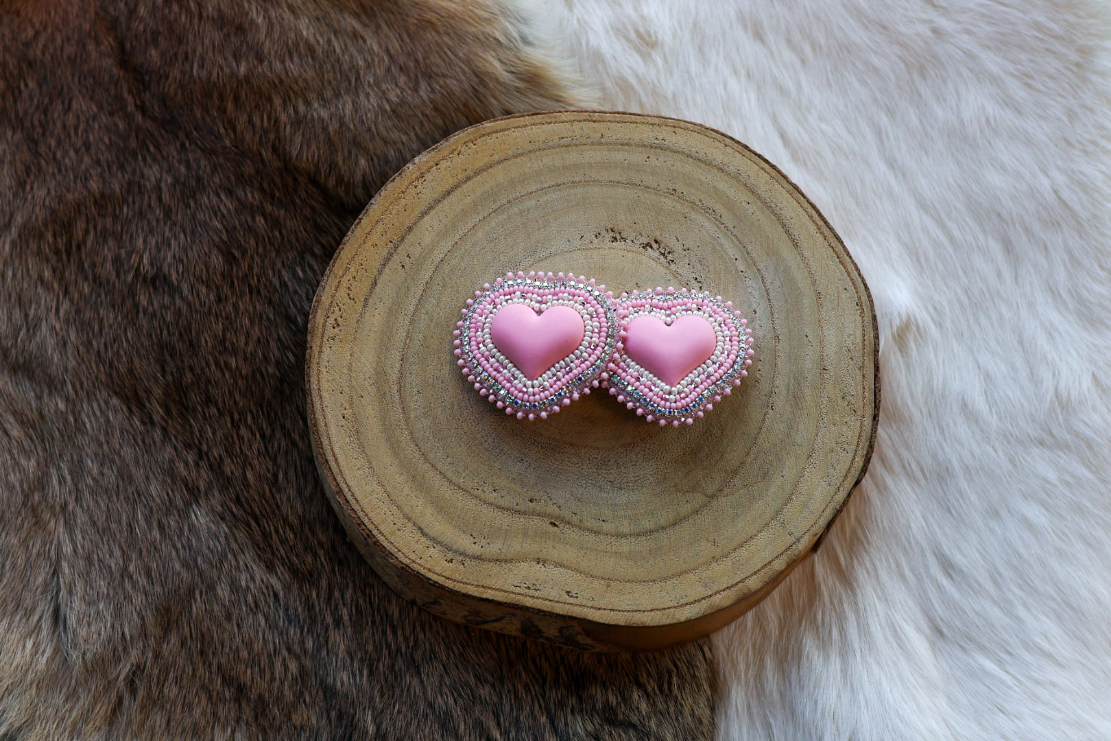 2" beautiful heart earrings featuring white size 11 seed beads, iridescent banding, and faux leather backing. Hand made by indigenous artist Nikki P.