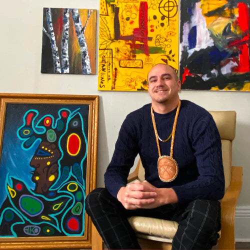 Cody James Houle, a self-taught Anishinaabe artist from Brantford, Ontario, has transformed a difficult upbringing in North Bay—marked by intergenerational trauma and the impacts of colonialism—into a powerful artistic journey rooted in pride and cultural strength. Active in the arts for five years, he creates woodland paintings, abstract works, and animate florals that reflect his Anishinaabe heritage and deep connection to nature. Houle views art as both a storytelling tool and a way to teach, drawing wisdom from past great artists in technique and philosophy. Dedicated to inspiring hope and self-expression, he encourages others, especially youth, to embrace creativity as a means of healing and celebrating Indigenous identity.