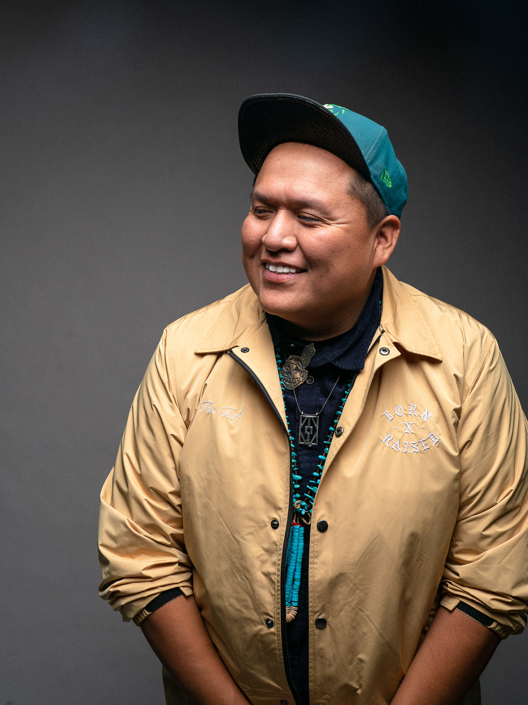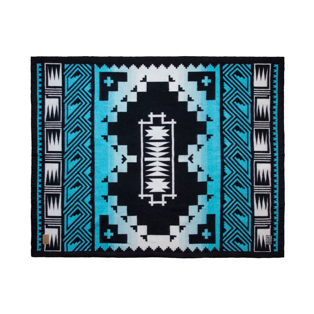This striking wool blanket by Jared Yazzie (Diné) pays homage to rug designs woven by his grandmothers. Within Navajo weaving, clues to where a rug has been woven can be found in patterns originating from specific areas, or colors of yarn dyed from particular plants.